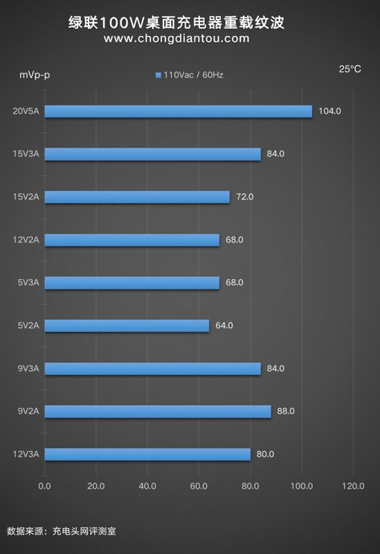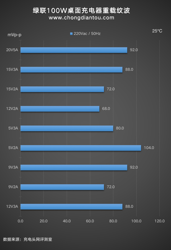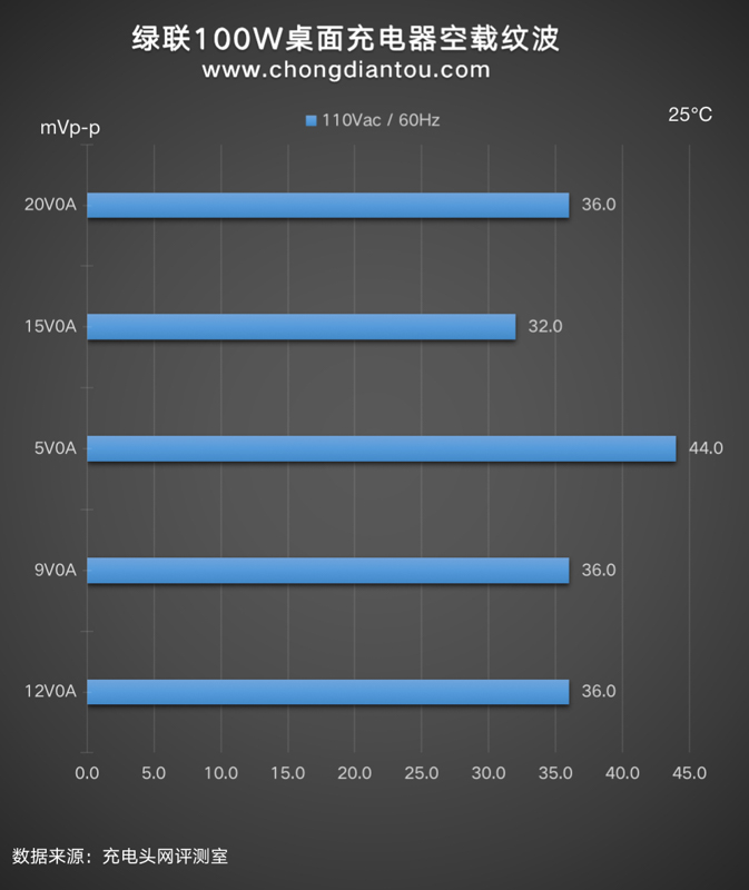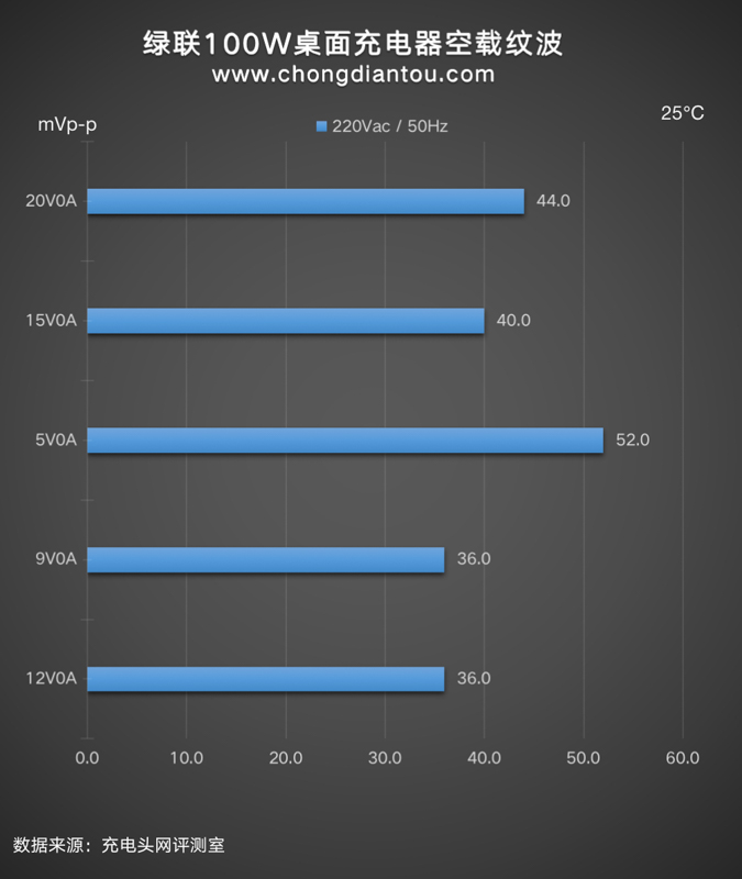 國家標準中充電器紋波要求是不高于200mVp-p,UGREEN綠聯100W四口桌面快充充電器在110V 60Hz、220V 50Hz輸入電壓下,所有輸出功率紋波峰峰值均低于200mVp-p這個標準,表現不錯。