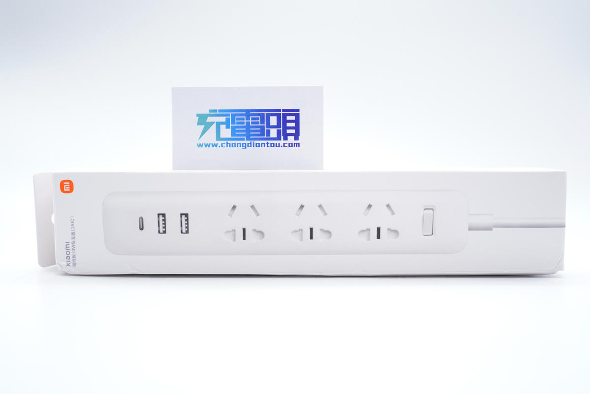 包裝盒正面印有小米品牌logo、產(chǎn)品外觀和插線板 20W 快充版(2A1C)名稱。