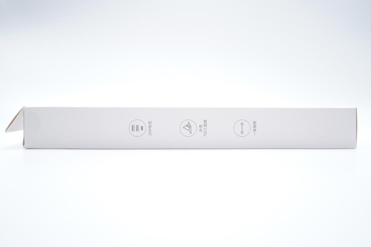 盒子側(cè)面印有20W快充、外殼750℃阻燃、一體銅帶三大賣點標(biāo)識。