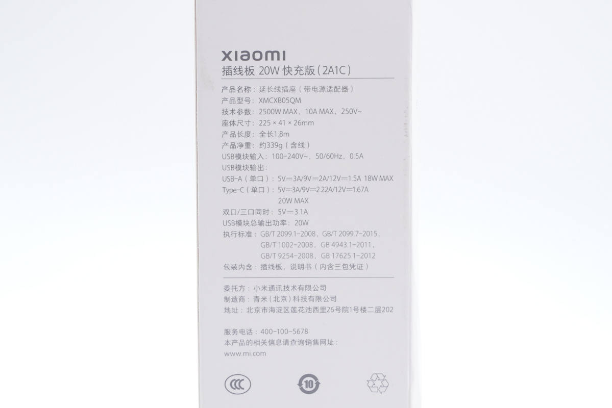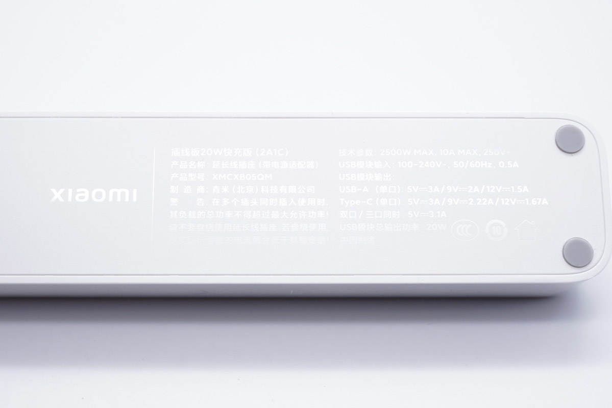 插頭內(nèi)側(cè)有xiaomi字樣以及10A 250V~規(guī)格參數(shù),通過了CCC認(rèn)證。