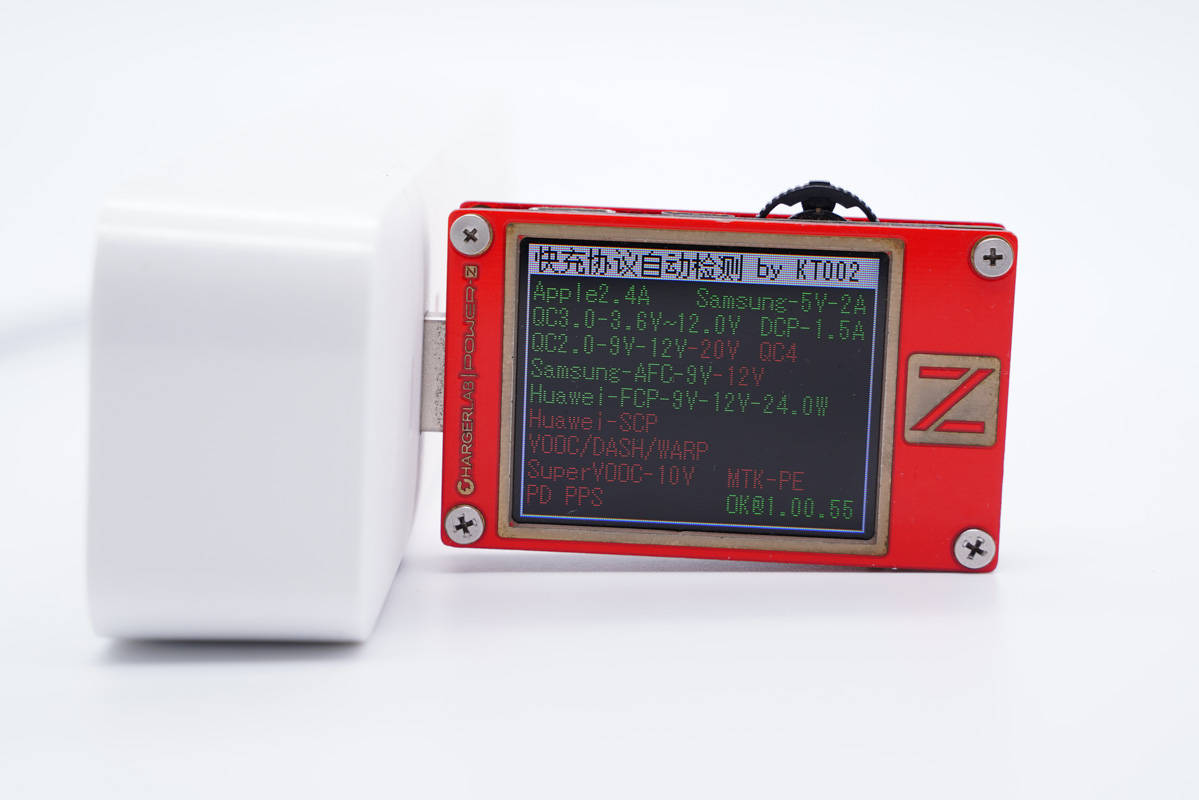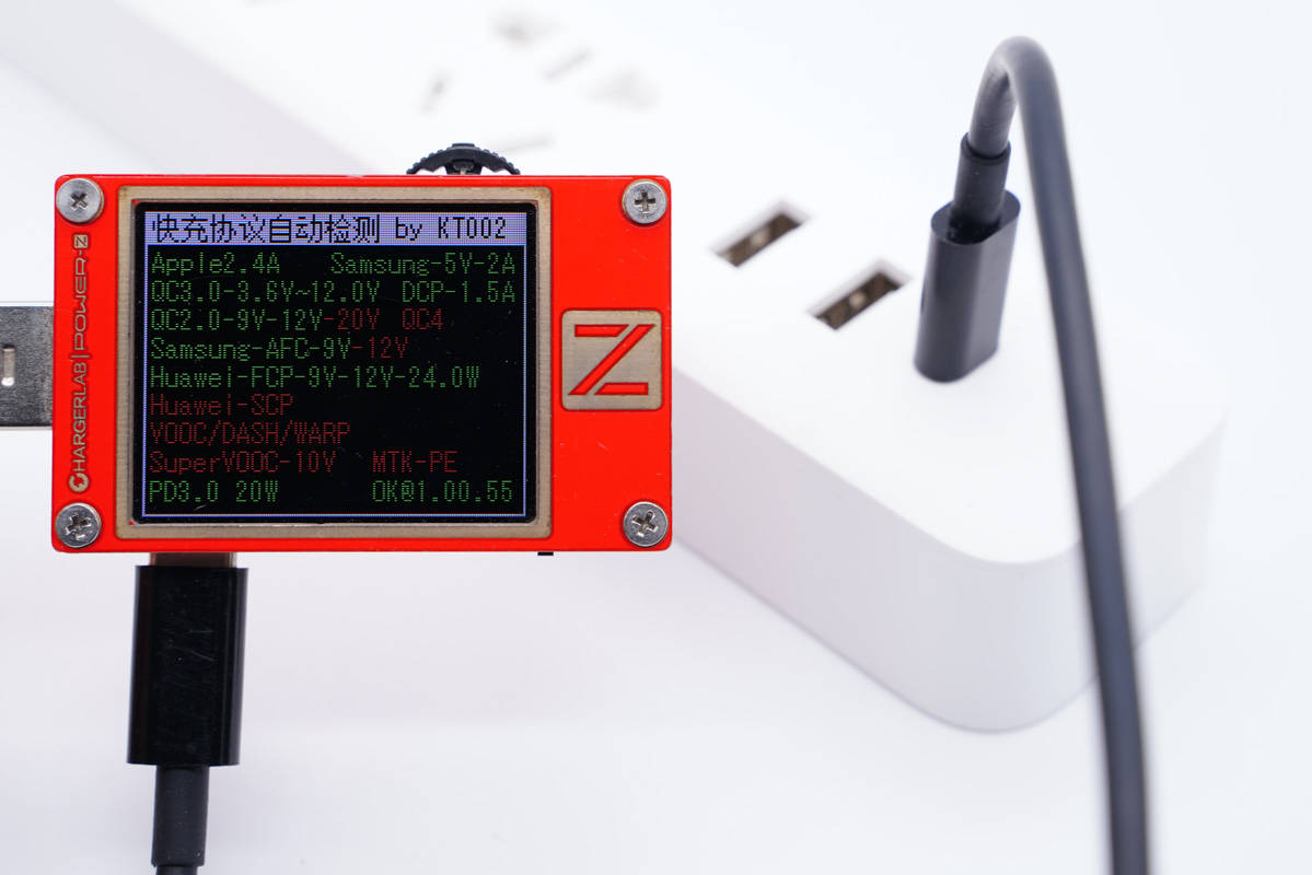 使用ChargerLAB POWER-Z KT002測得USB-A口支持Apple 2.4A、Samsung 5V2A、DCP協(xié)議,以及QC2.0/3.0、AFC、FCP快充協(xié)議。