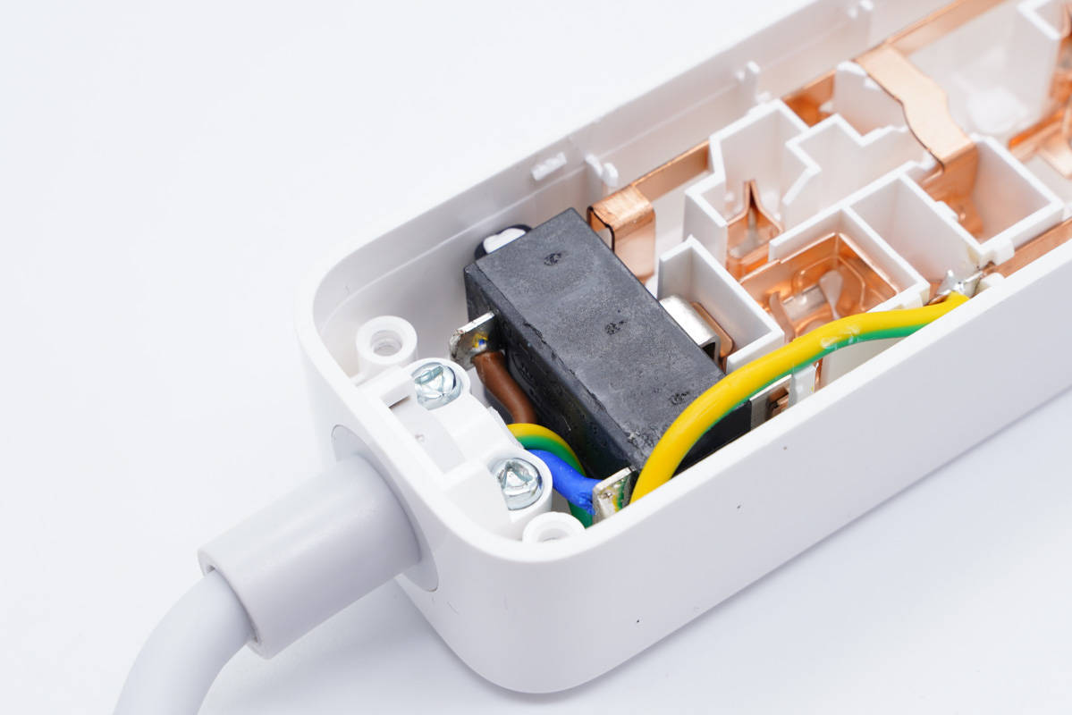 插線板機身殼采用四顆三角防拆螺絲封裝固定,拆掉螺絲即可打開外殼,后蓋設(shè)有隔離板。