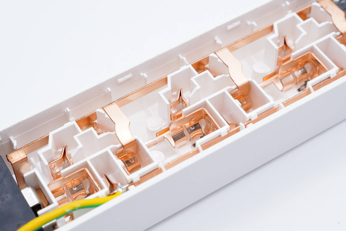 插線板采用的是一體成型銅帶,通過凹槽卡扣固定。