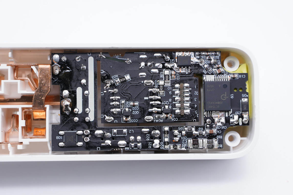 插線板設(shè)計上采用長條機身,十分節(jié)省桌面空間。充電頭網(wǎng)拆解了解到,插線板機身殼采用防拆螺絲封裝,內(nèi)置一體成型銅帶無斷點,且固定牢固。充電器PCB板使用機身殼隔離板固定和進行初次級隔離。
