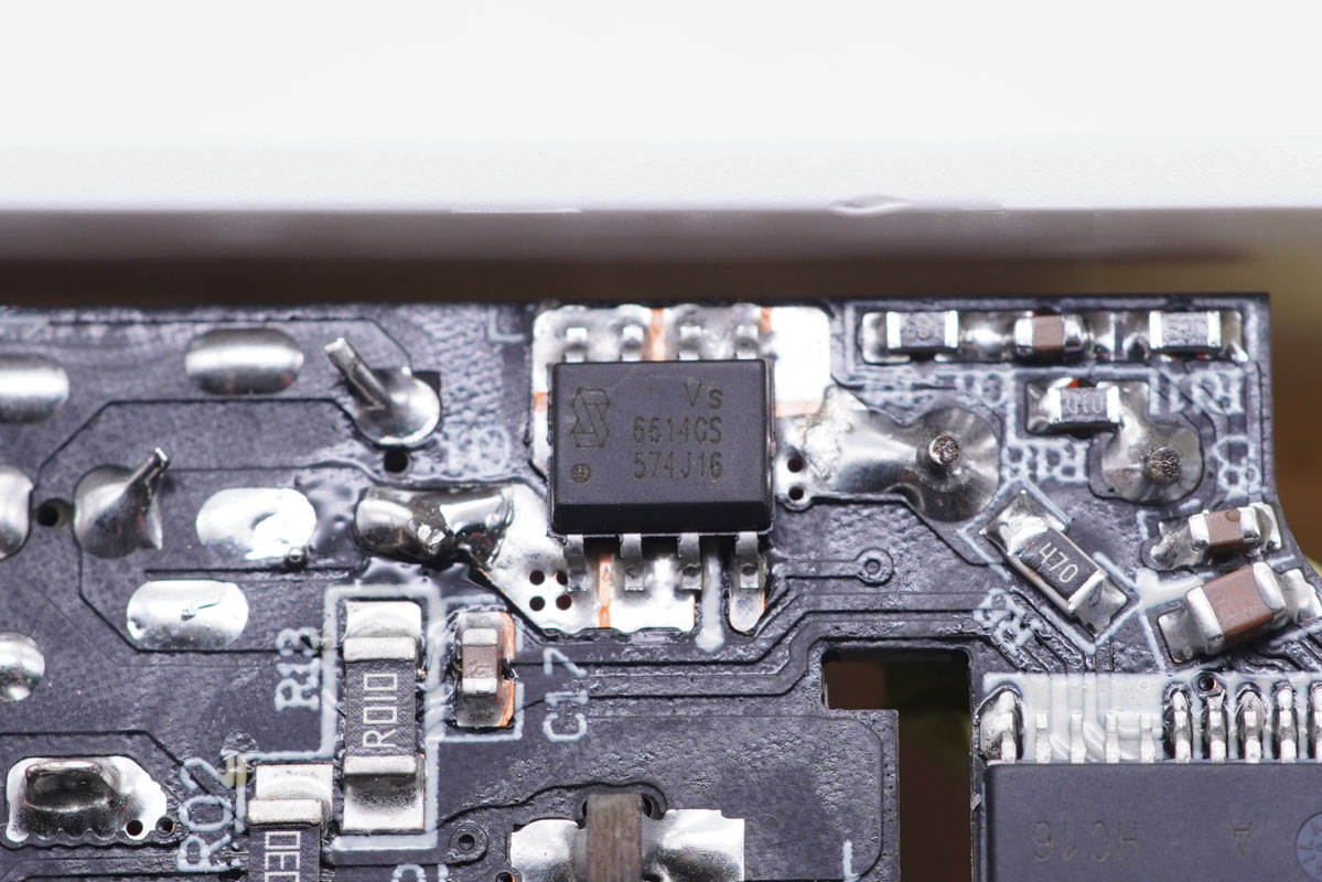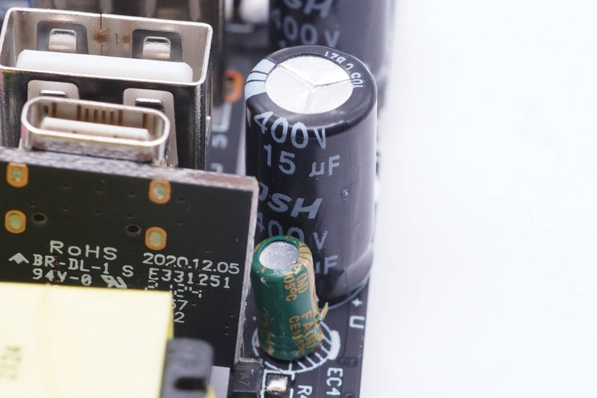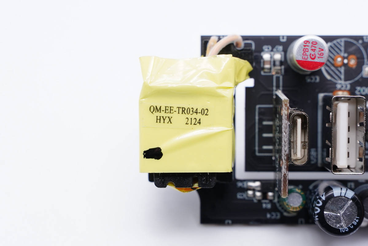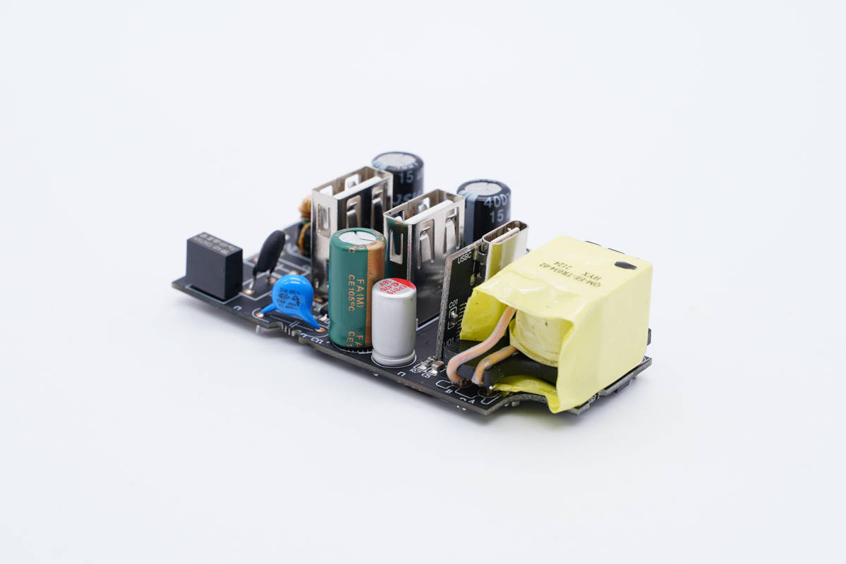 主板一端設(shè)有變壓器,側(cè)邊是Y電容和兩顆濾波電容,USB-C母座使用小板垂直焊接。