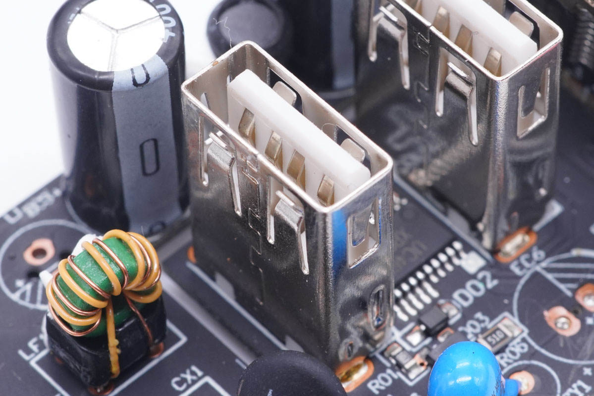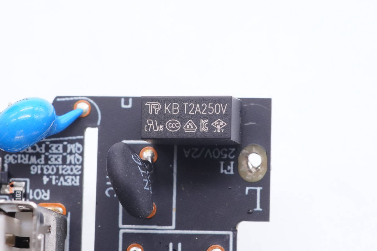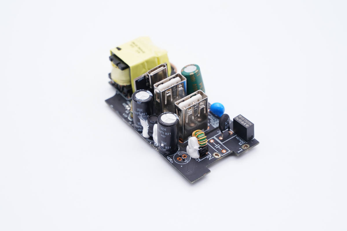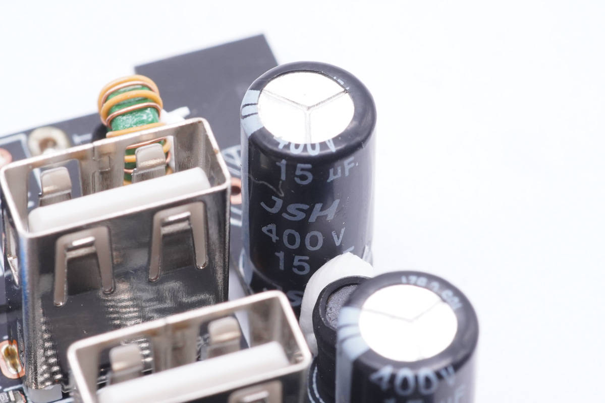 主板一端設(shè)有變壓器,側(cè)邊是Y電容和兩顆濾波電容,USB-C母座使用小板垂直焊接。