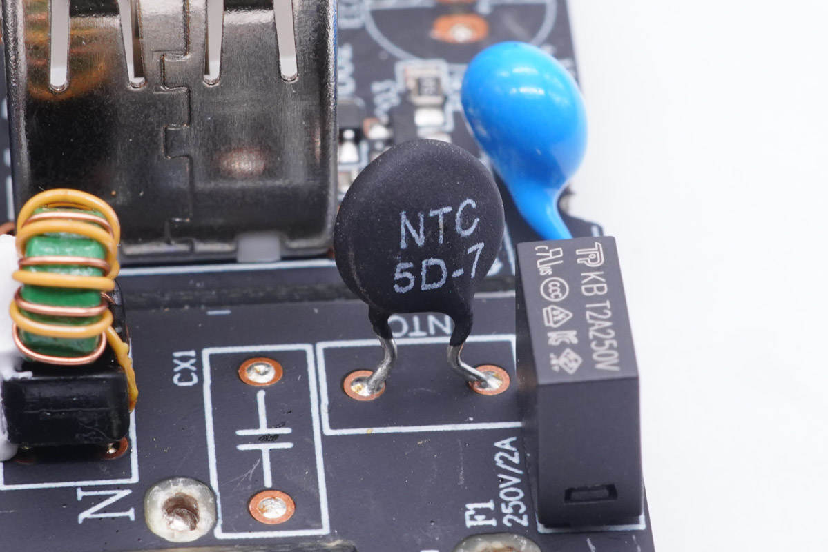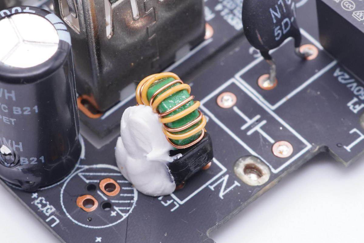充電器輸入端一覽,設(shè)有延時保險絲、NTC浪涌抑制電阻、共模電感,側(cè)邊使用兩顆高壓濾波電解電容和工字電感。