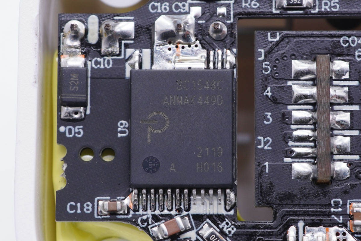 充電器采用了知名大廠PI SC1548C主控芯片搭配威兆VS6614GS同步整流管組成開關(guān)電源,以及UC4300+UC4600多口快充協(xié)議方案控制三個USB接口輸出電壓,整體方案可靠。采用萬京源電解電容和鈺邦固態(tài)電容濾波,也很可靠。