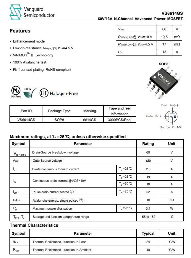 同步整流管采用威兆VS6614GS,NMOS,耐壓60V,SOP8封裝。