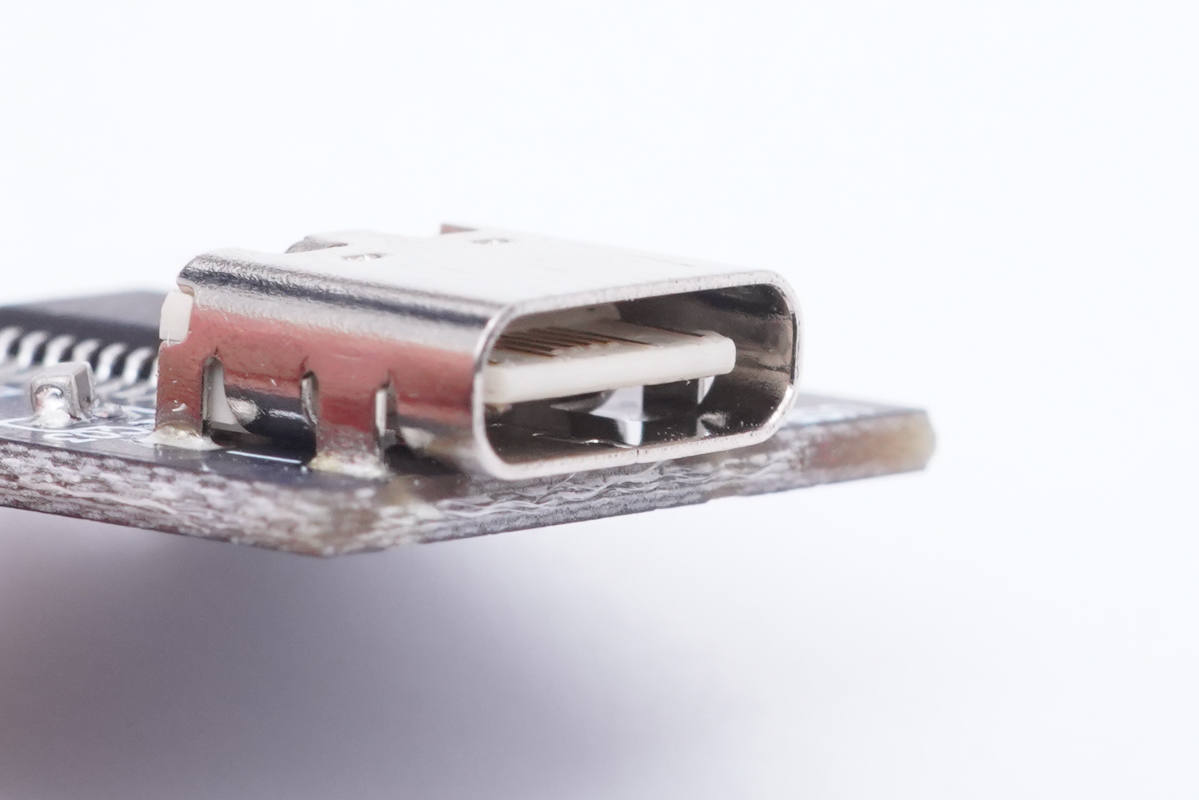 USB-C母座特寫,過孔焊接。