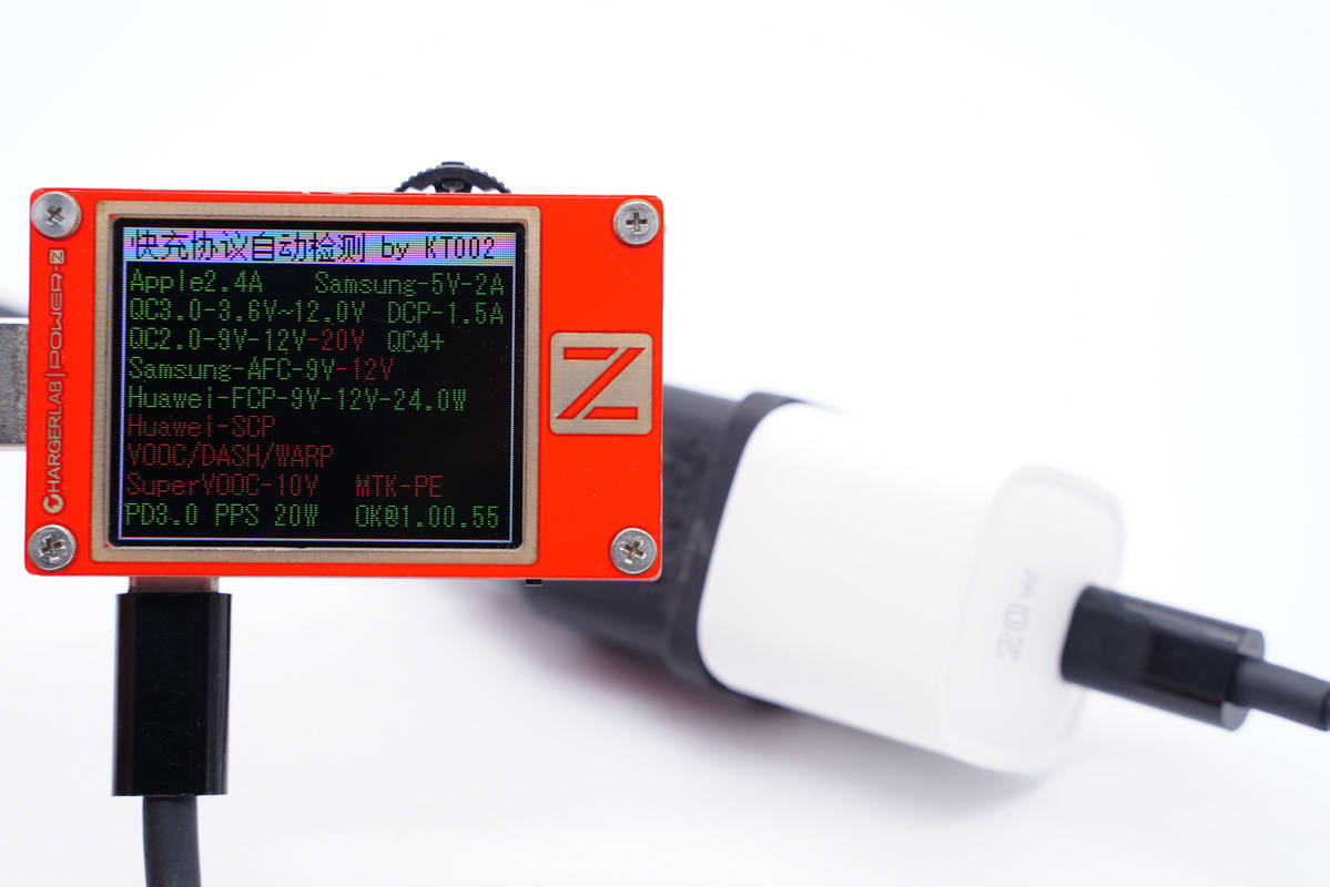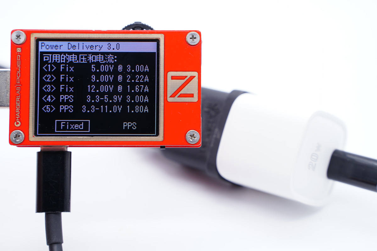 使用ChargerLAB POWER-Z KT002測得USB-C口支持Apple 2.4A、Samsung 5V2A、DCP協議,以及QC2.0/3.0、AFC、FCP、PD3.0、PPS快充協議。