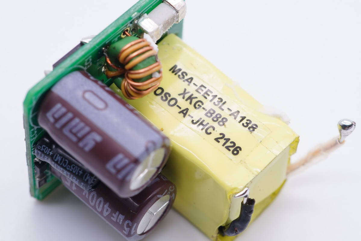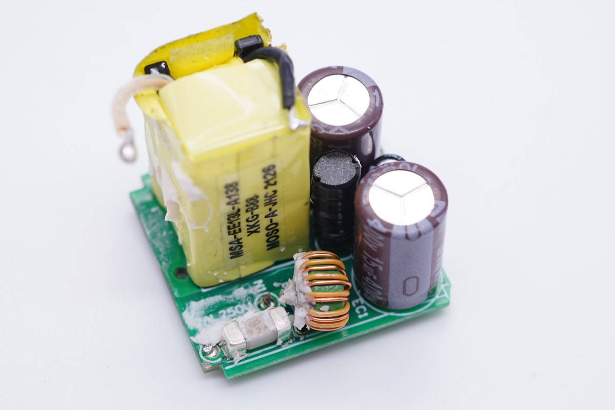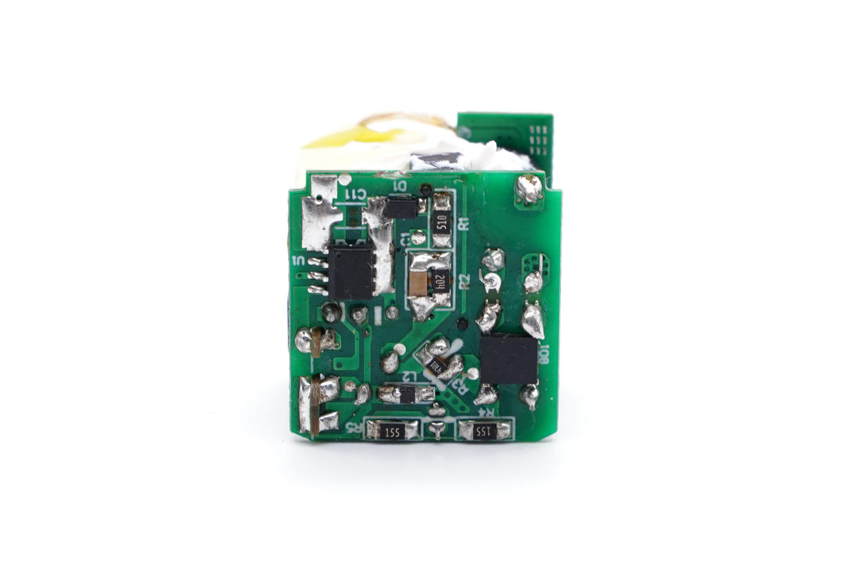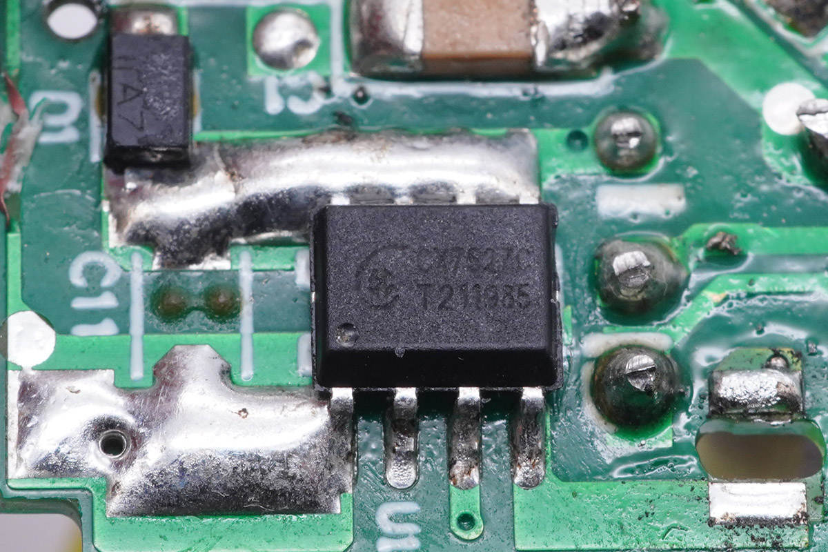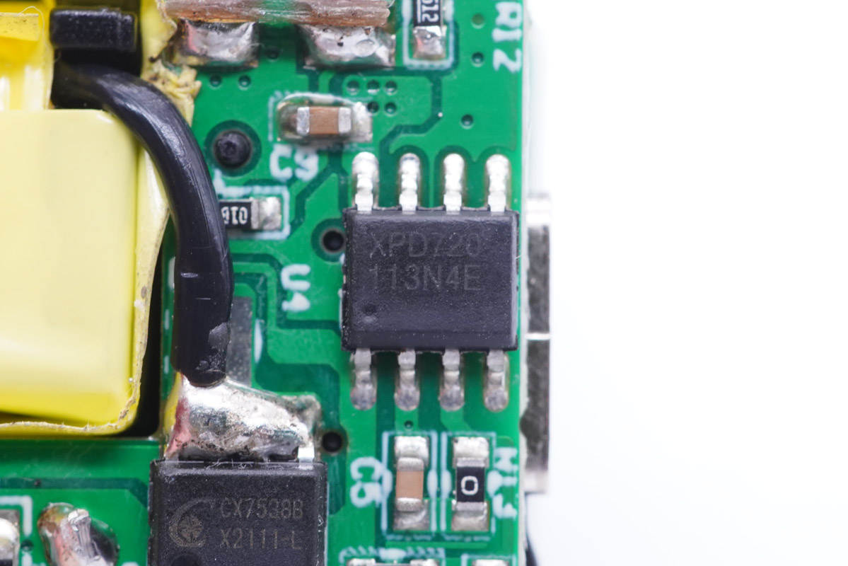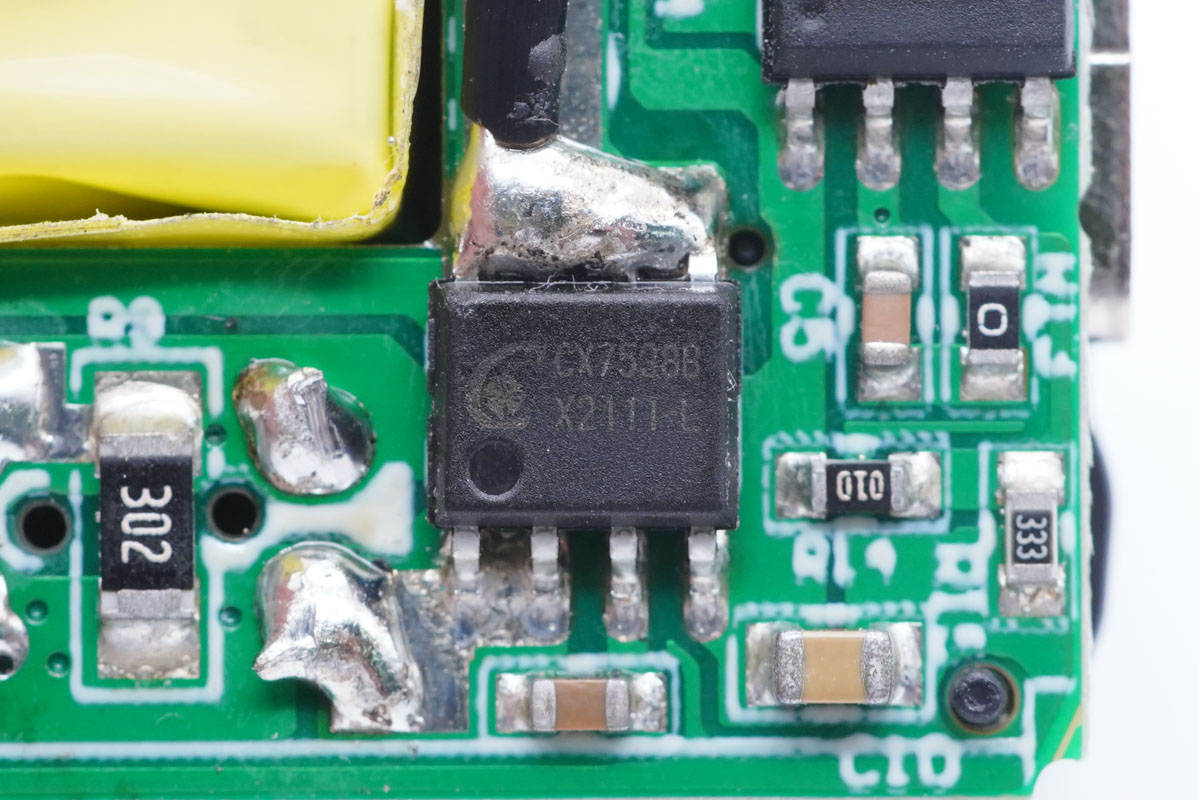 可以清楚地看到該款充電器電源主控芯片是采用誠芯微科技CX7527C,這是一顆高性能多模式PWM反激式控制器。該產品方便用戶以較少的外圍元器、較低的系統成本設計出高性能的交直流轉換開關電源。其提供了極為全面和性能優異的智能化保護功能,包括逐周期過流保護、過載保護、軟啟動、芯片過溫保護、VDD欠壓/過壓鎖定保護功能。
