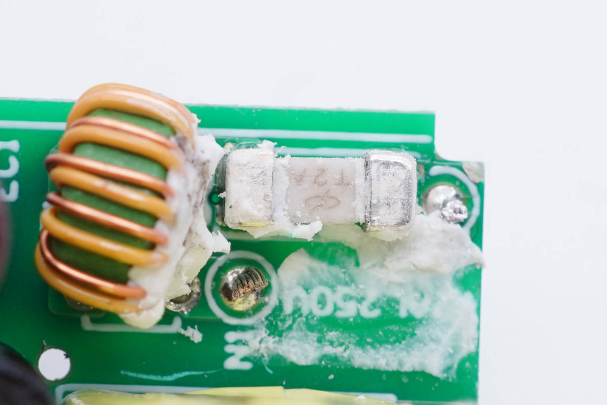 輸入端小板正面設有貼片保險絲、共模電感、高壓濾波電解電容和變壓器等器件。