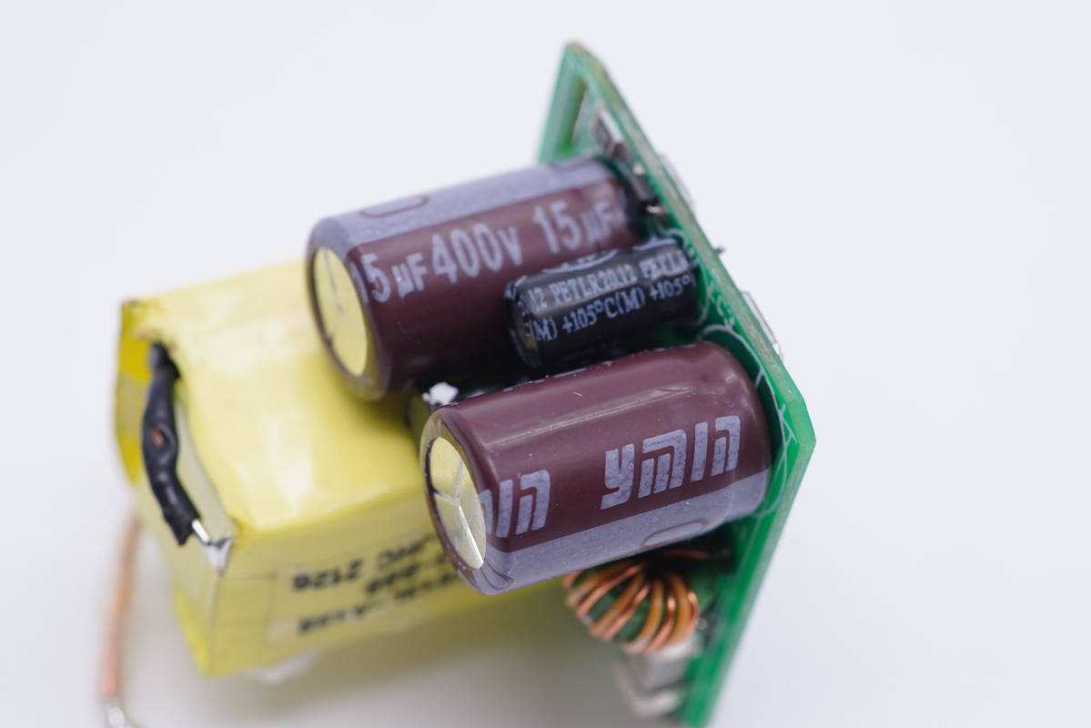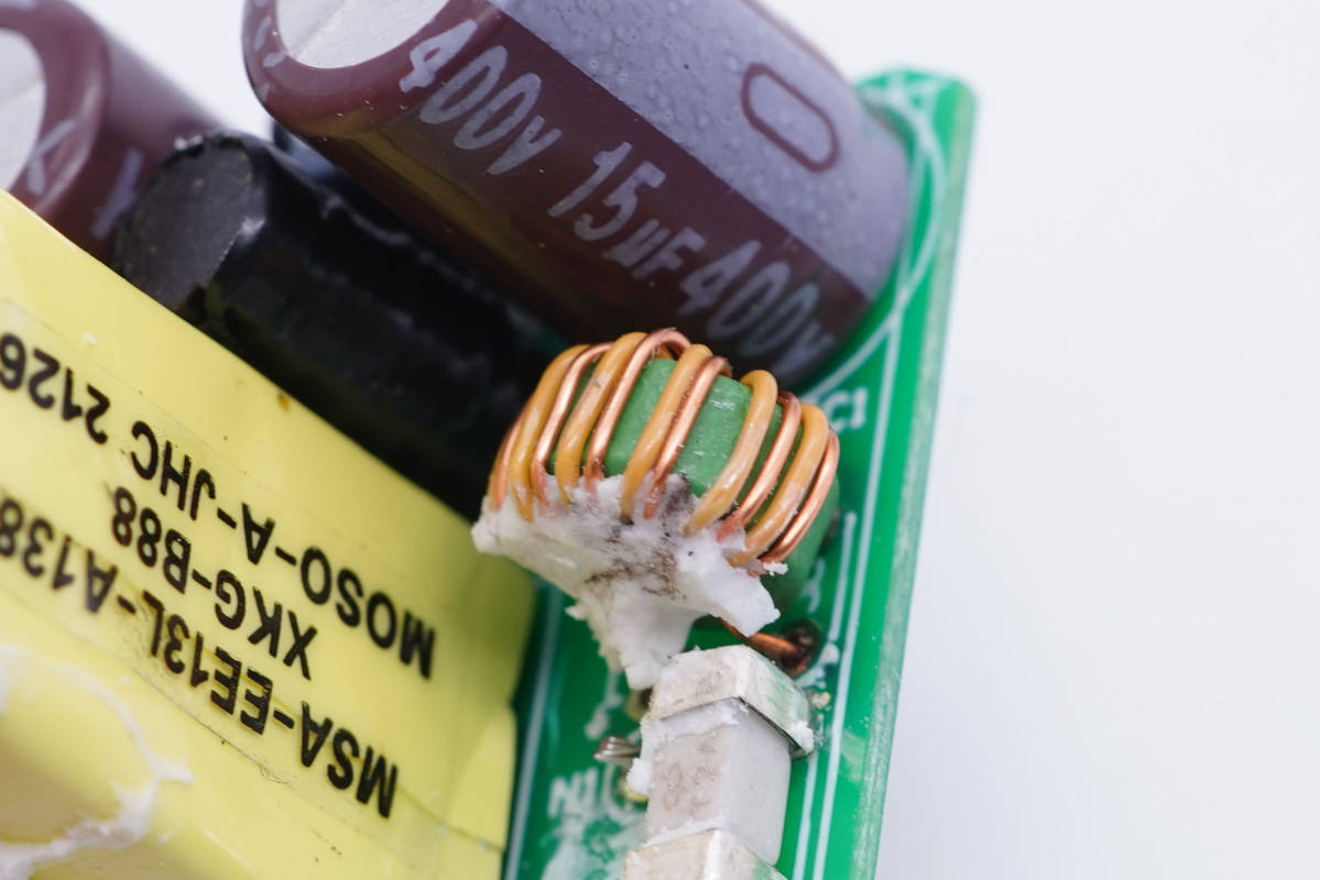 兩顆高壓濾波電解電容采用永銘KCX系列產品,規格均為400V 15μF。該系列產品工作溫度范圍在-55℃~105℃,3000小時壽命,并具備抗雷擊、低漏電流(低待機功耗)、高紋波電流、高頻低阻抗等性能優勢。
