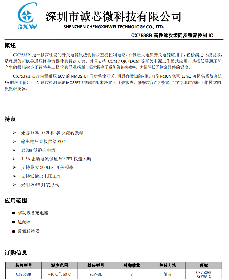 誠芯微CX7538B 支持開關電源的CCM/QR/DCM模式,非常適合3.3~12V快充同步整流使用,內置耐壓60V,11mΩ的同步整流管,可提供3A輸出。比肖特基效率最高提升6%,工作電壓范圍寬,外圍元件非常簡單,在寬電壓應用時,外圍只需一顆電容。