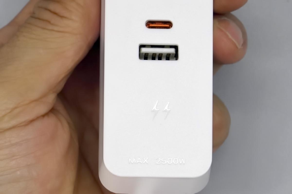 另一端設有1A1C接口,此外凹印閃電logo和 MAX 2500W字樣,這款插座最大承載功率2500W。