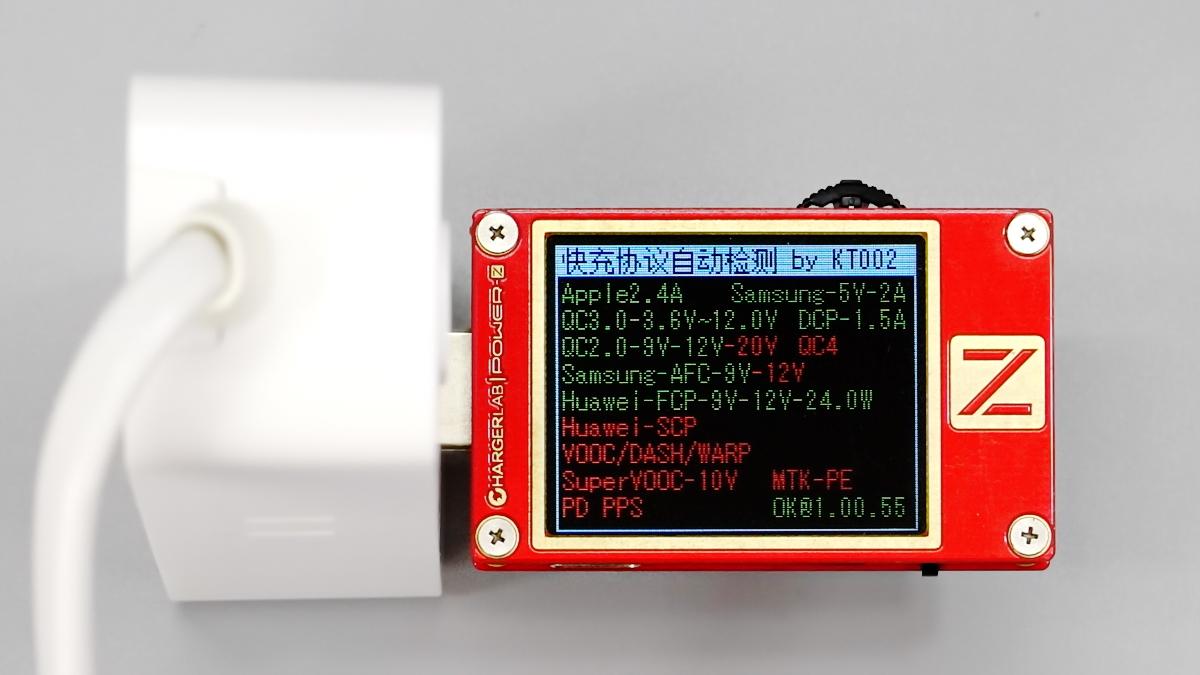 使用ChargerLAB POWER-Z KT002測得USB-A口支持Apple 2.4A、Samsung 5V2A、DCP協議,以及QC2.0/3.0、AFC、FCP快充協議。