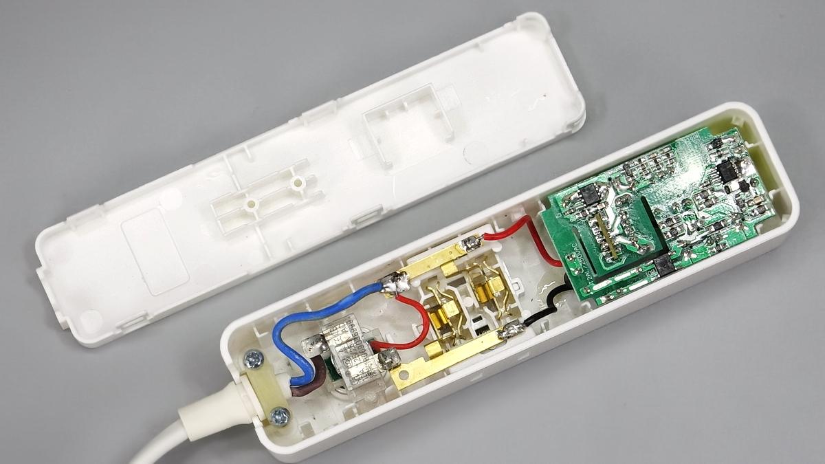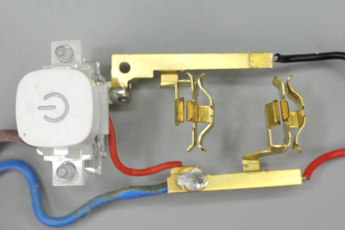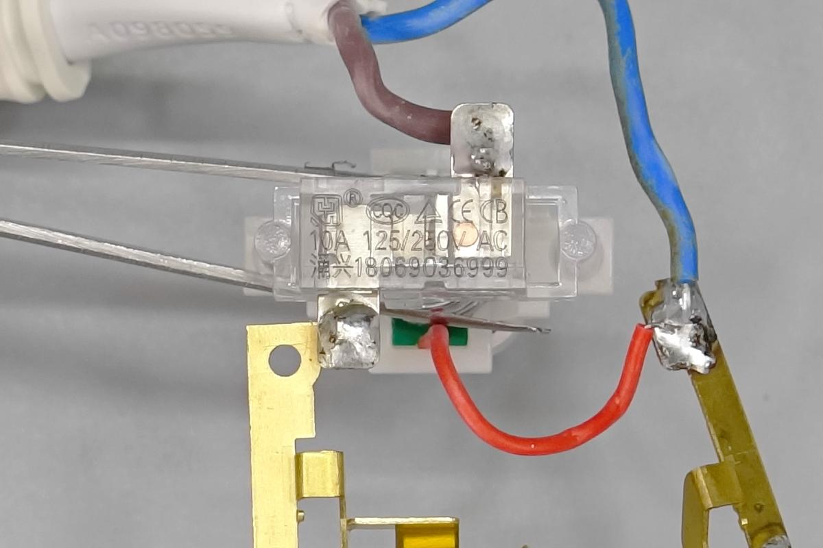 插座機身殼通過卡扣封裝,電源線使用螺絲和鎖扣進行固定。PCB板使用隔離板固定,通過導線和黃銅片連接通電。