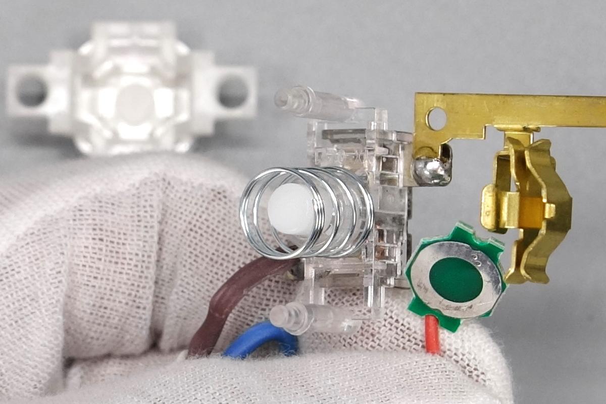 拆開電源鍵,彈簧和小板接觸通電設計。