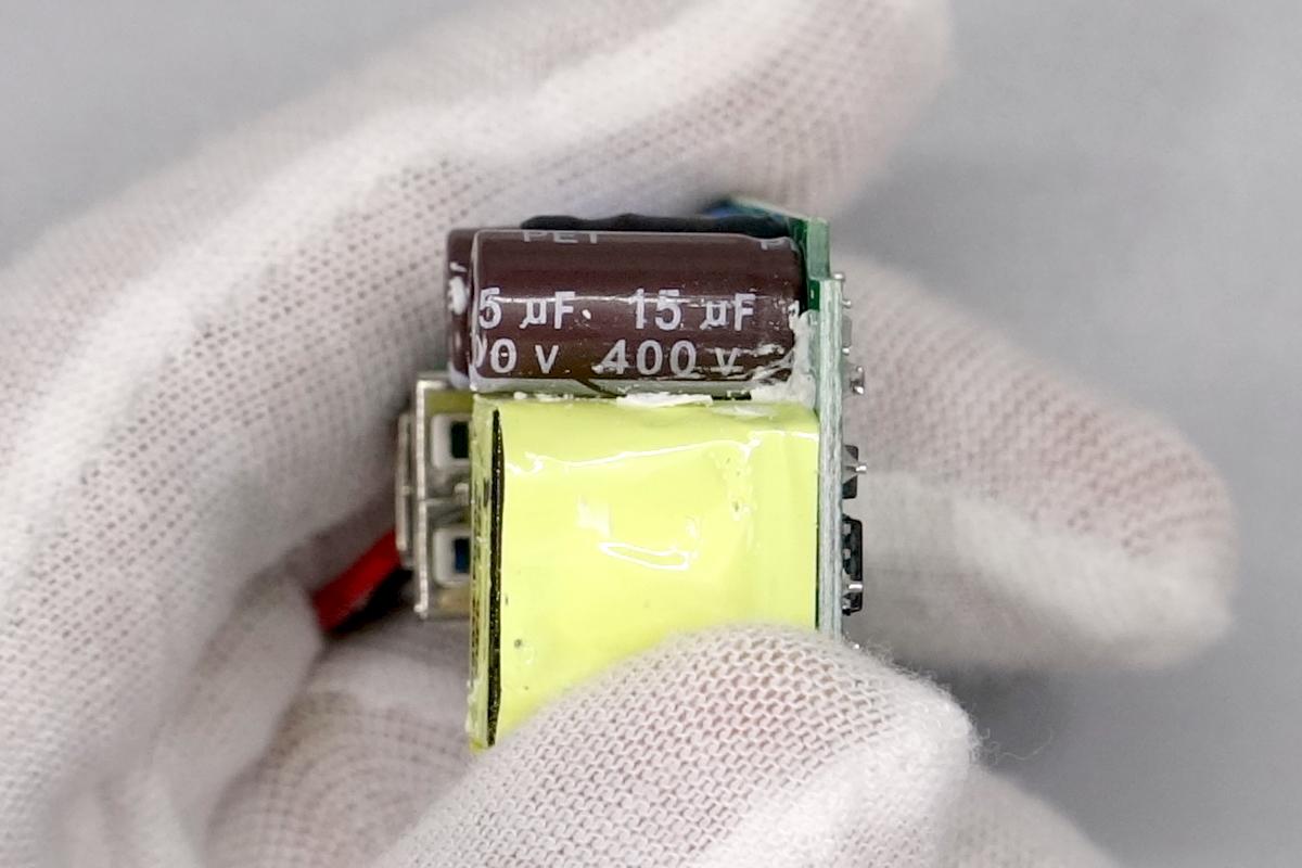 PCB板空間充裕,保險絲外套絕緣管保護,輸出濾波固態電容規格為16V 470μF,兩顆高壓濾波電解電容之間還有工字電感和主控芯片供電電容,并且打膠固定。