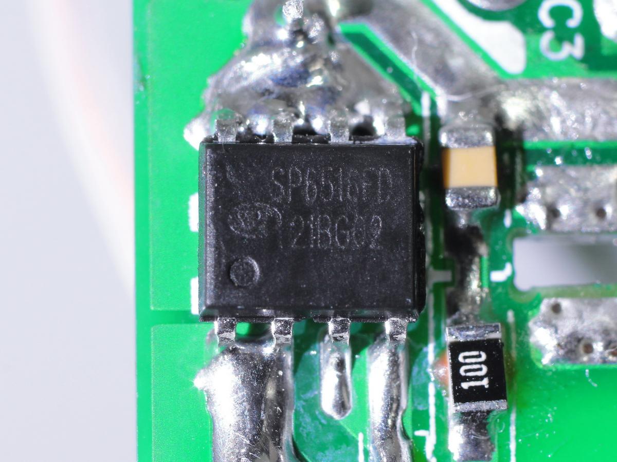 充電頭網通過拆解了解到,得益于高集成開關電源方案,插座內部充電器模塊非常簡化。內部采用硅動力SP6649HF+SP6516FD高集成QR開關電源方案,云矽半導體XPD738協議芯片,整體方案集成度高,電路非常簡潔。