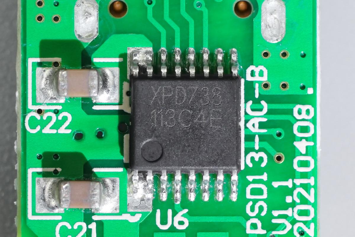 協議芯片采用云矽半導體XPD738,用于1C1A雙口控制。XPD738通過了USB PD3.0認證(TID:3479),支持PD2.0/3.0、PPS、QC2.0/3.0、FCP、SCP、HVSCP、AFC等快充協議,很適合應用在1C1A雙端口充電設備上,支持任意單口快充雙口輸出5V,在A口連接蘋果充電線但未接入蘋果手機時,C口仍然有快充。