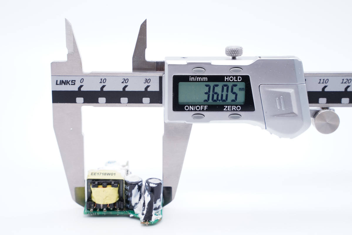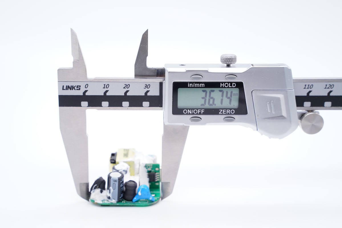 主板一側(cè)設(shè)有保險絲、高壓濾波電解電容、工字電感、主控芯片供電電容以及Y電容。