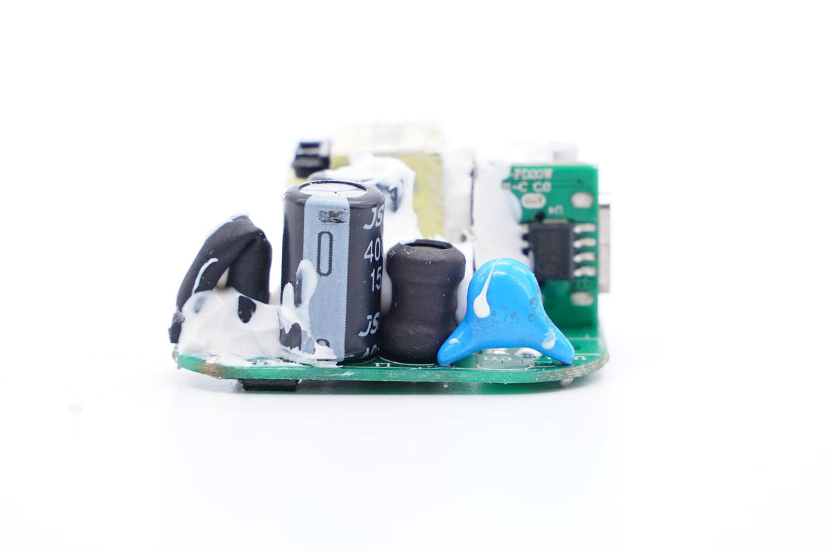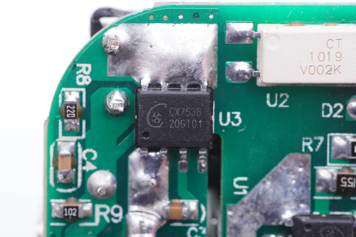 充電頭網(wǎng)通過拆解了解到,充電器采用了誠芯微CX7509+CX7538+CX2919C一整套快充方案,方案集成度非常高,性能可靠。同時很有效精簡外圍電路降低系統(tǒng)成本,還能夠有效幫助充電器實現(xiàn)“小冰塊”等特征。此外充電器還采用了萬京源和豐賓電容進行輸入輸出濾波,電容等器件打膠加固,整體的用料做工相當Nice。