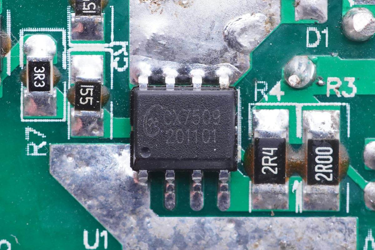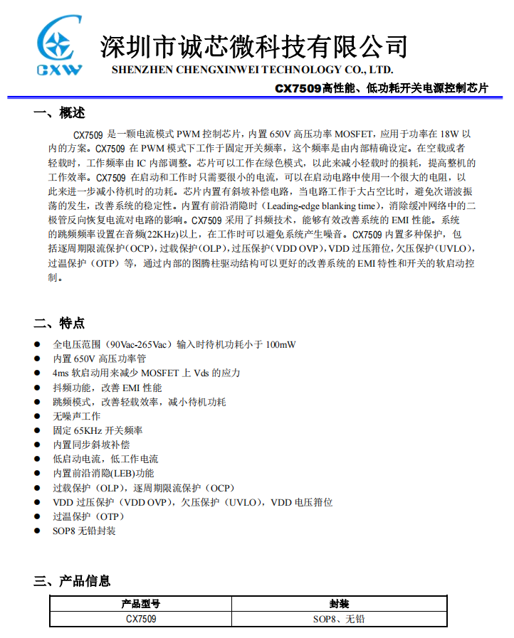 開關(guān)電源主控芯片采用誠芯微CX7509,這是一顆電流模式PWM控制芯片,內(nèi)置650V高壓功率 MOSFET,應(yīng)用于功率在18W以內(nèi)的方案。在PWM模式下工作于固定開關(guān)頻率,這個頻率是由內(nèi)部精確設(shè)定。