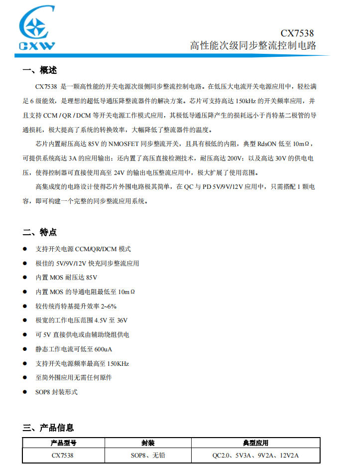 CX7538內(nèi)置耐壓高達85V的NMOSFET同步整流開關(guān),且具有極低的內(nèi)阻,典型RdsON低至 10mΩ,可提供系統(tǒng)高達3A的應(yīng)用輸出;還內(nèi)置了高壓直接檢測技術(shù),耐壓高達200V;以及高達30V的供電電壓,使得控制器可直接使用高至24V的輸出電壓整流應(yīng)用中,極大擴展了使用范圍。