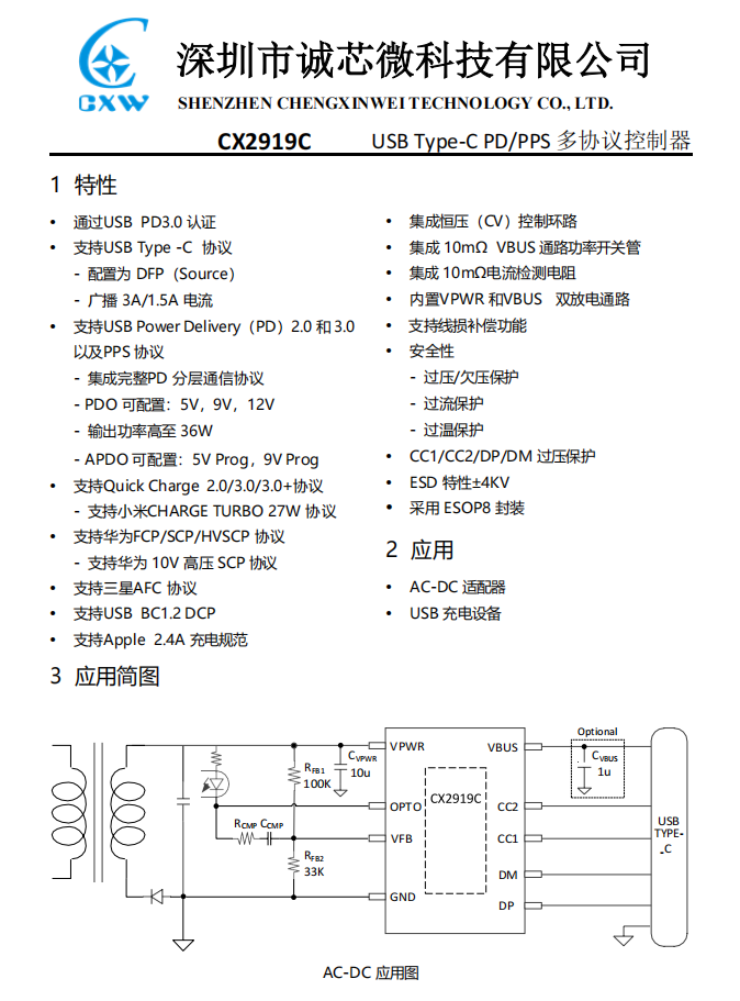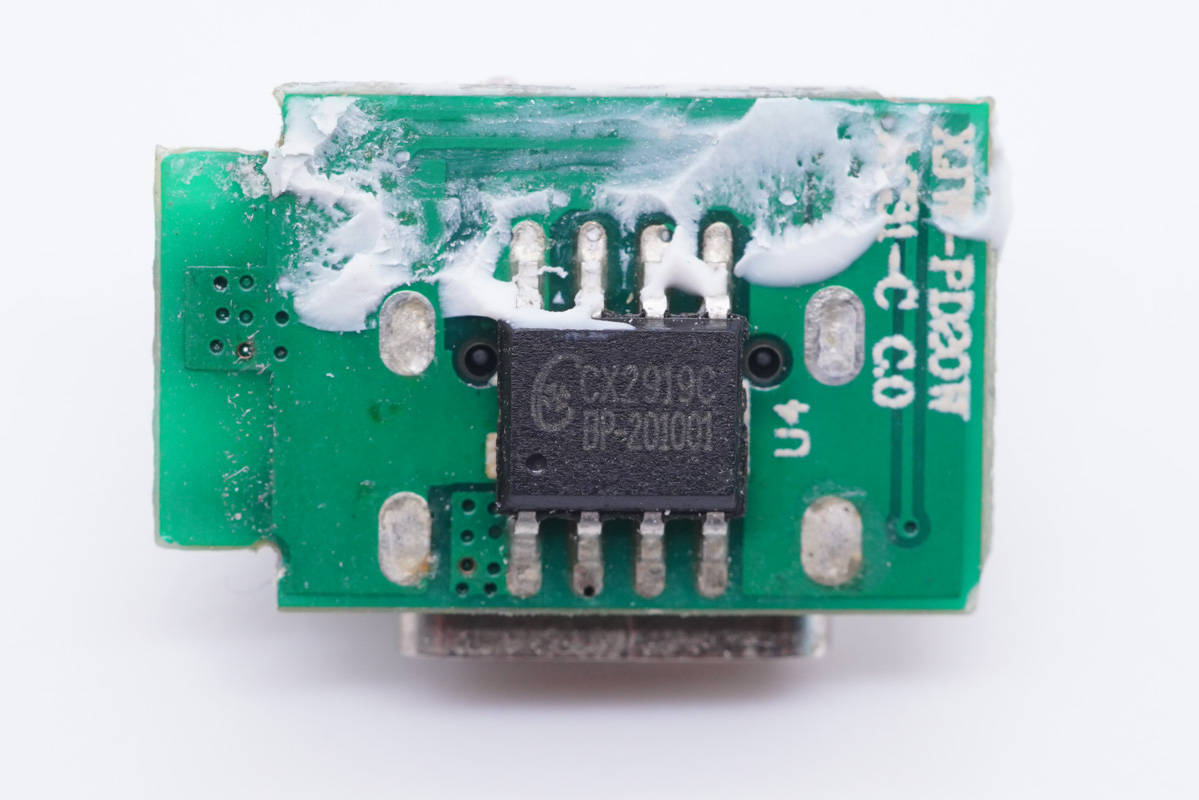 協(xié)議芯片采用誠芯微CX2919C,這款芯片已經(jīng)通過了USB PD3.0認證,支持QC2.0、QC3.0、AFC、FCP、SCP、HVSCP、PD和PPS等快充協(xié)議,可配置5V、9V、12V電壓檔位,最大輸出功率36W。