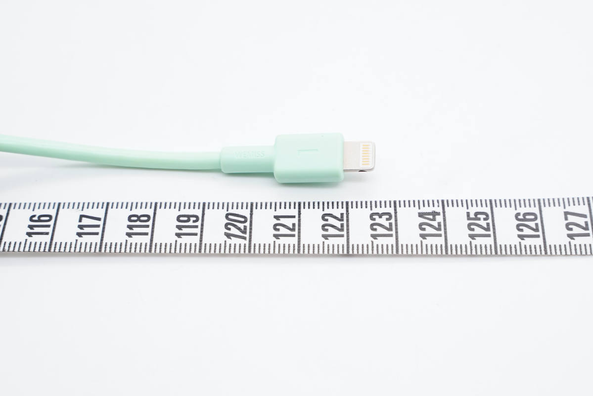線纜做了抗彎折處理,網尾處凹印WEMISS品牌logo,兩個線頭塑料殼上則分別凹印L和C字樣。