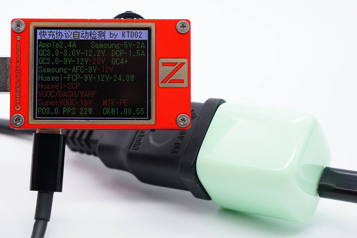 使用ChargerLAB POWER-Z KT002測得USB-C口支持Apple 2.4A、Samsung 5V2A、DCP協議,以及QC2.0/3.0、AFC、FCP、PD3.0、PPS快充協議。