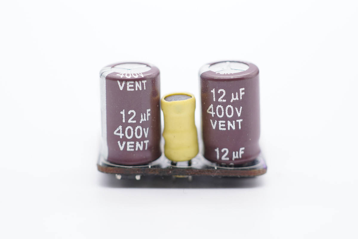 兩顆高壓濾波電解電容規格都是400V 12μF,工字電感外套熱縮管保護。