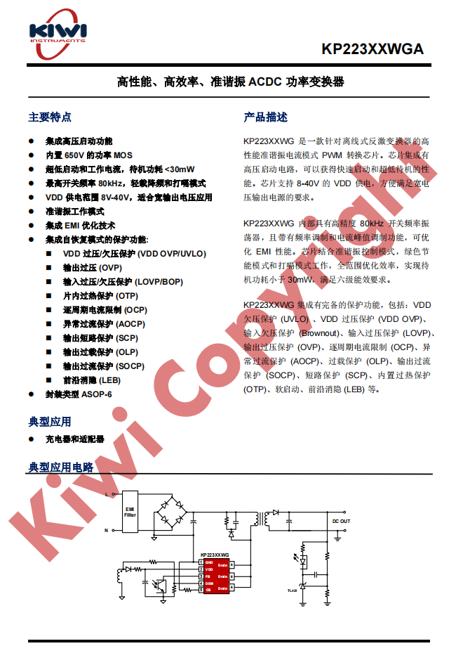 KP223XXWG集成有完備的保護功能,包括:VDD 欠壓保護(UVLO)、VDD 過壓保護 (VDD OVP)、輸入欠壓保護(Brownout)、輸入過壓保護(LOVP)、輸出過壓保護(OVP)、逐周期電流限制(OCP)、異常過流保護 (AOCP)、過載保護(OLP)、輸出過流保護 (SOCP)、短路保護(SCP)、內置過熱保護(OTP)、軟啟動、前沿消隱 (LEB) 等。獨有的ASOP6封裝實現了更好的散熱性能。該系列產品使用不同的內置MOSFET,其中KP223315AWGA能夠滿足30W的快充需求,性能優,體積小。