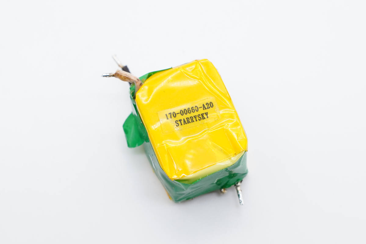 變壓器特寫,采用黃綠絕緣膠帶嚴密包裹。