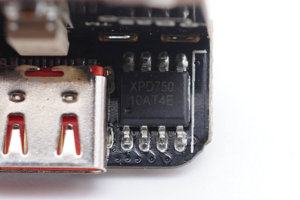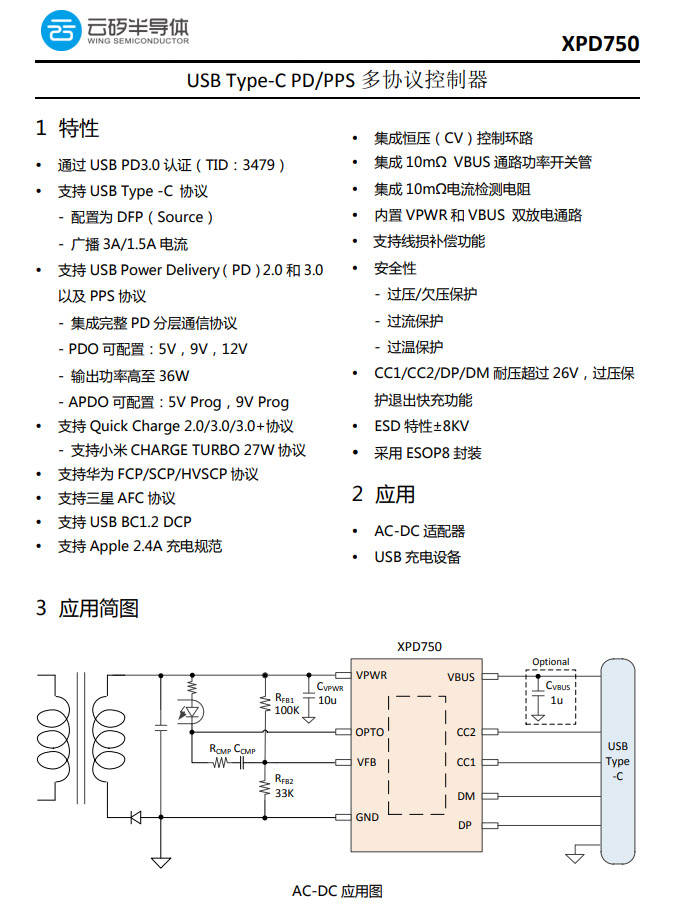 協議芯片采用云矽半導體XPD750。XPD750通過了USB PD3.0認證(TID:3479),支持PD2.0/3.0、PPS、QC2.0/3.0、FCP、SCP、HVSCP、AFC等快充協議,內部集成10mΩ VBUS通路功率開關管,并且集成10mΩ電流檢測電阻,支持完善的保護功能,節省外圍元件數量,降低成本。采用ESOP8封裝。