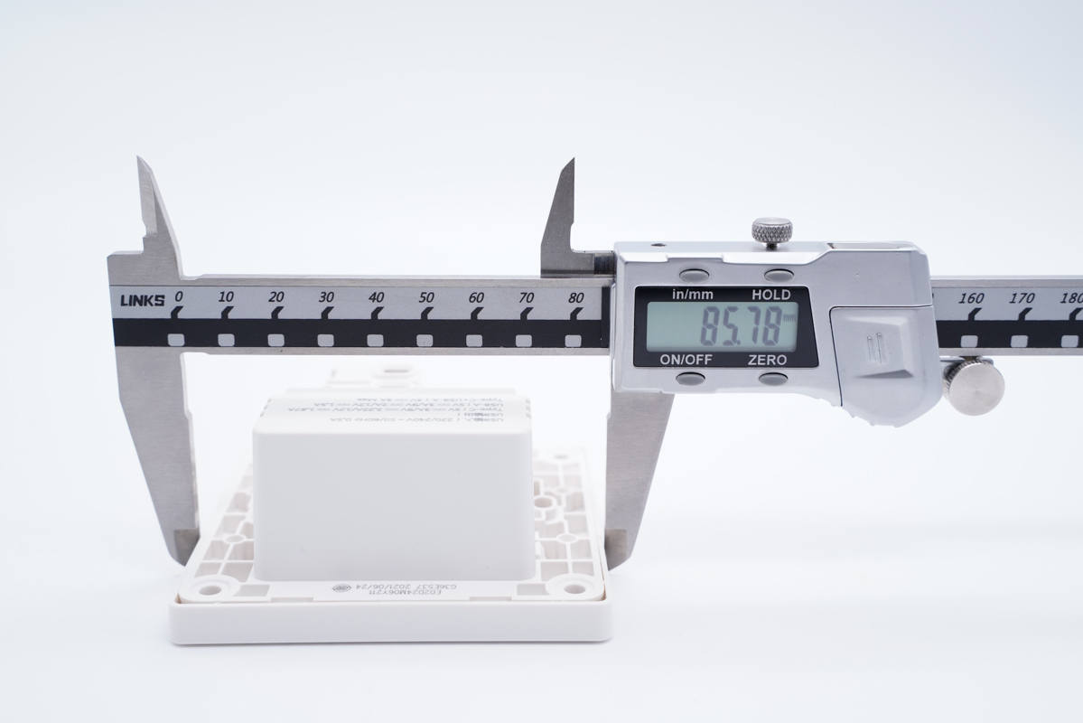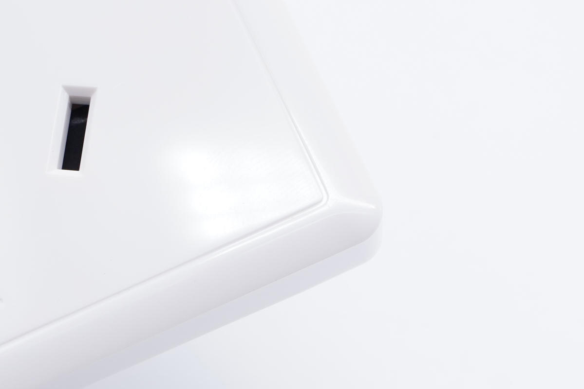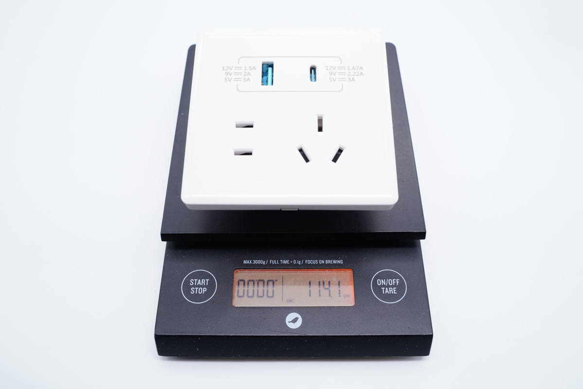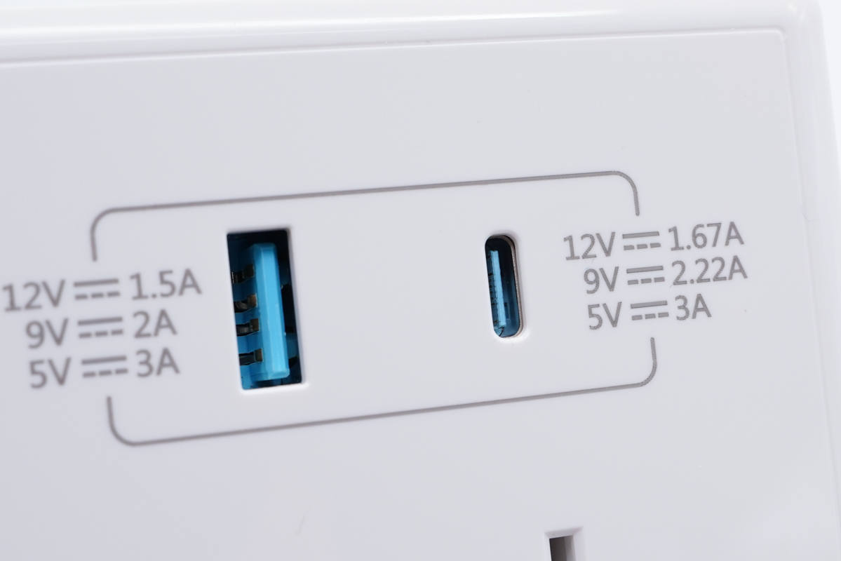插座采用經典方塊造型設計,外殼表面高光亮面處理,十分光滑。插座下方是AC插口,上方是1A1C USB接口,兩個接口旁都印有輸出參數,非常直觀。