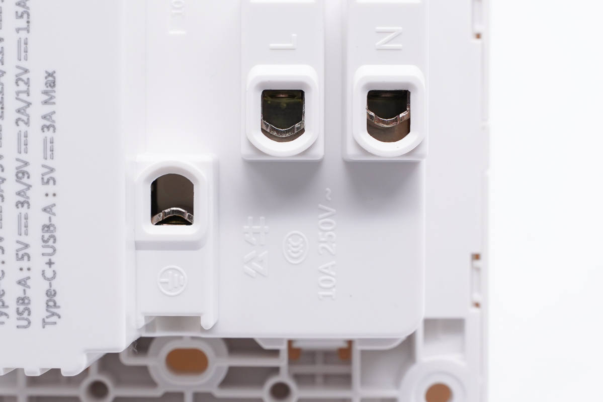 插座背面有電線插孔,使用螺絲固定,外殼上印有產品參數信息