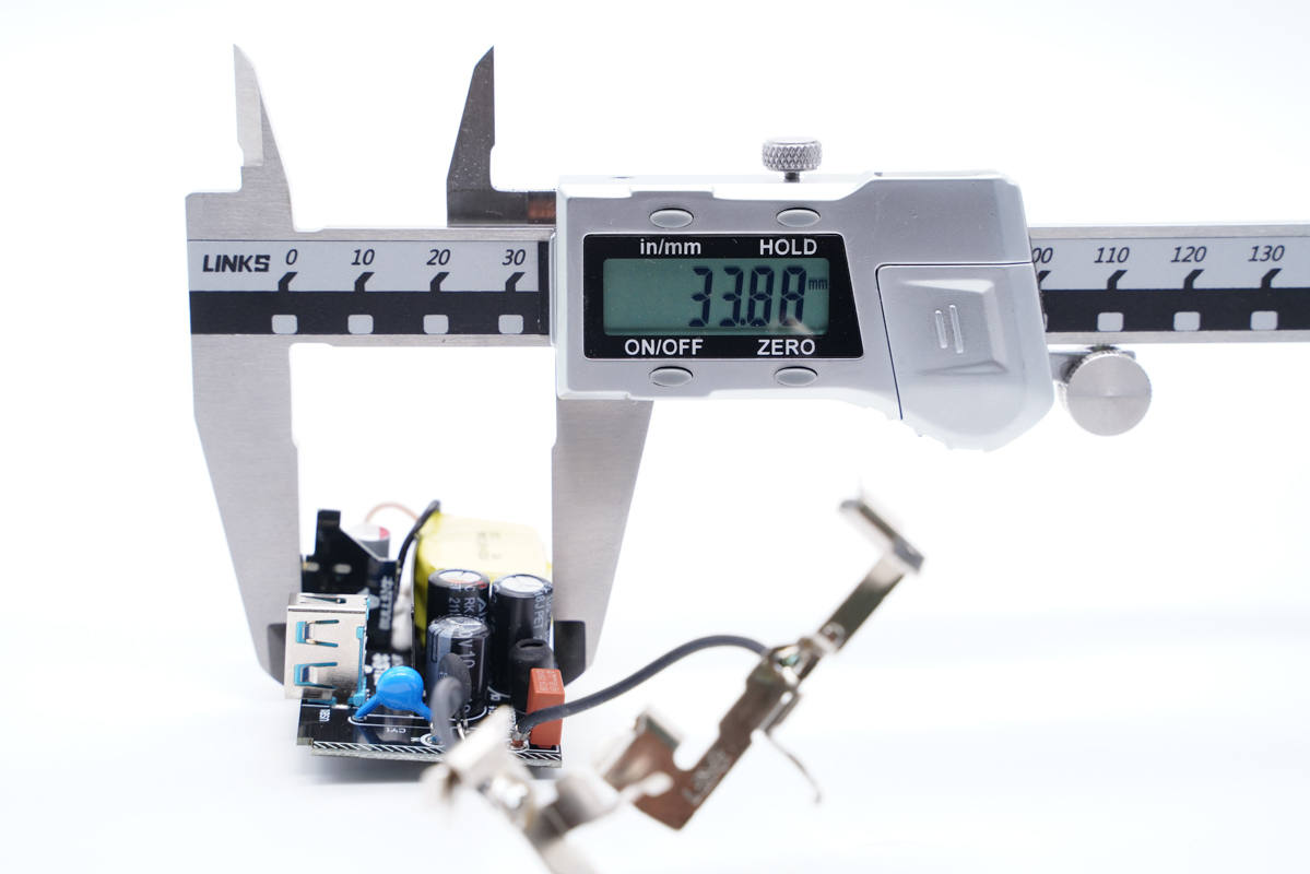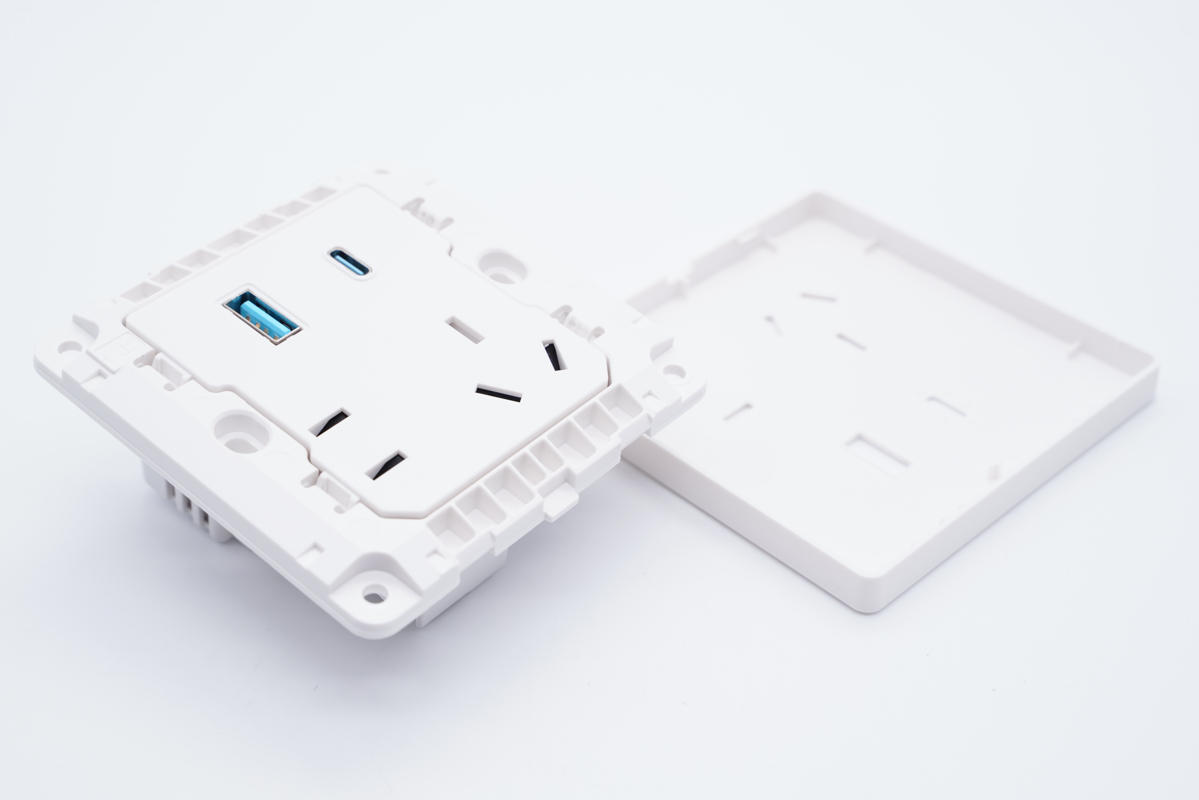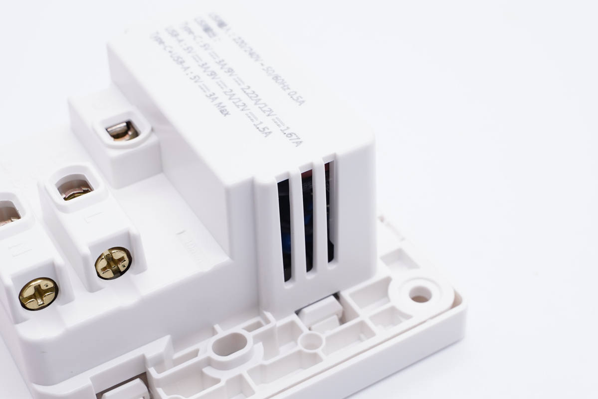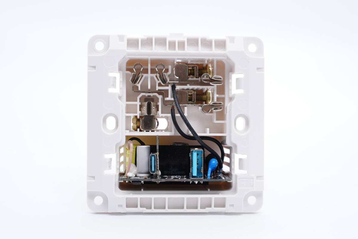 插座內設AC插孔和充電器模塊槽位,插座內部使用鍍鎳一體銅帶抗氧化。AC插孔和充電器模塊之間有隔離板隔離,通過黑色導線連接取電。