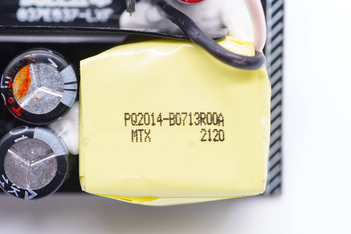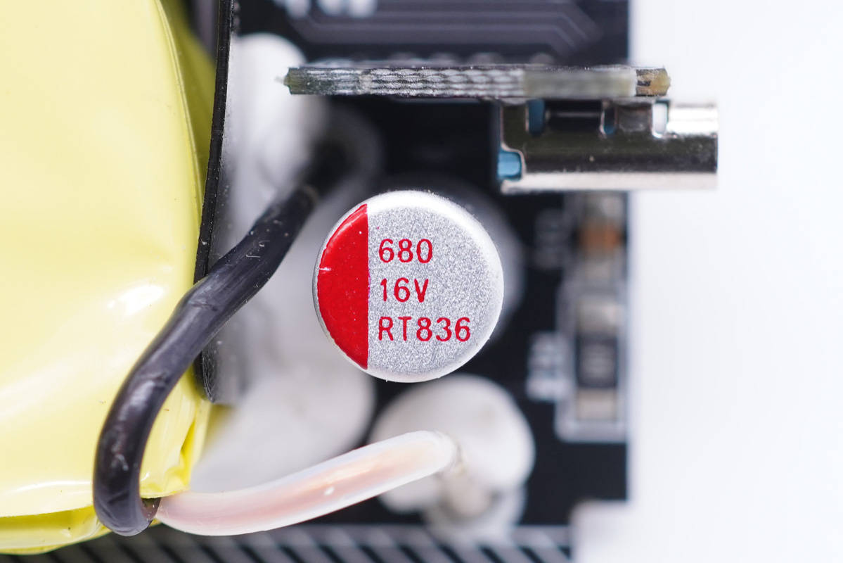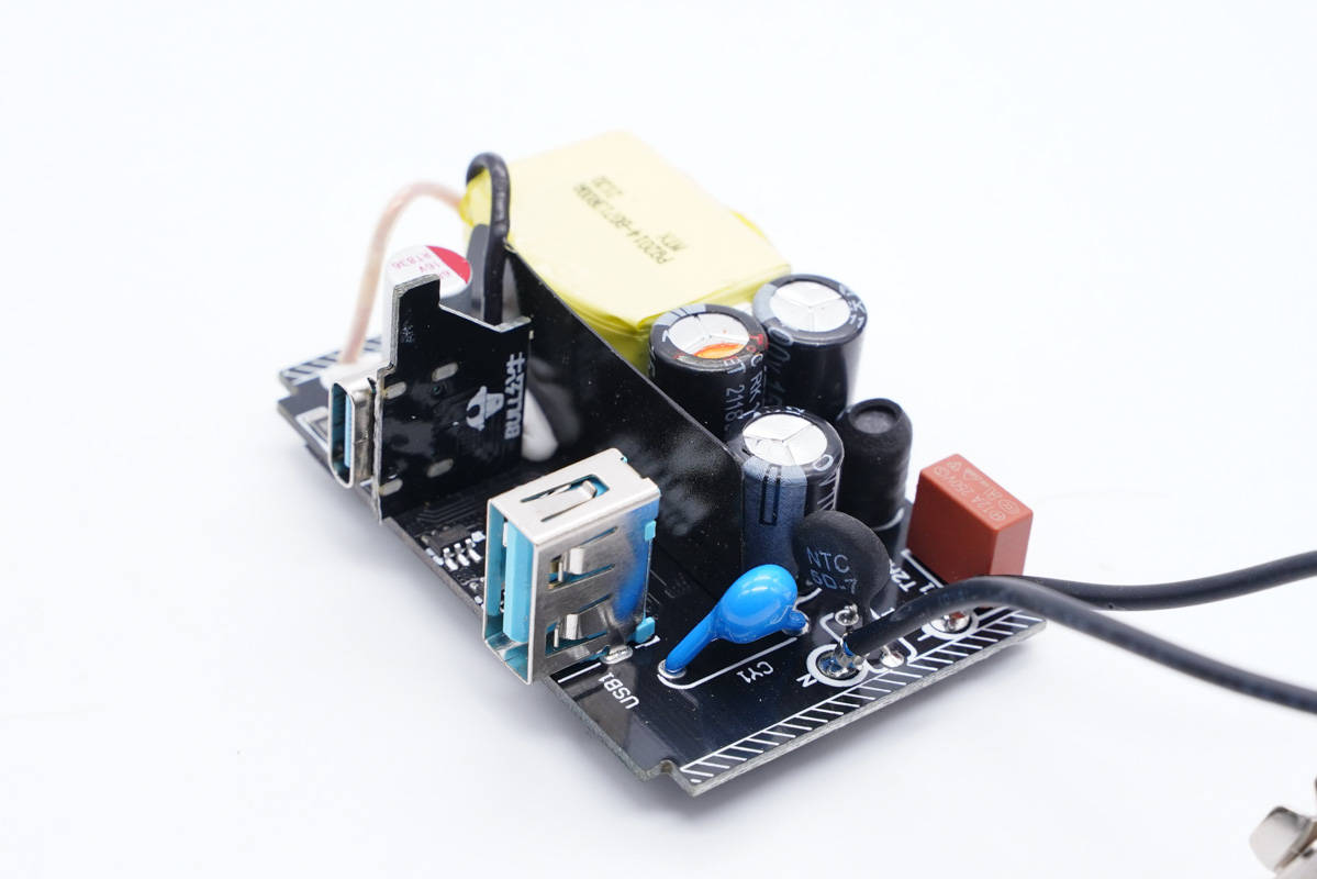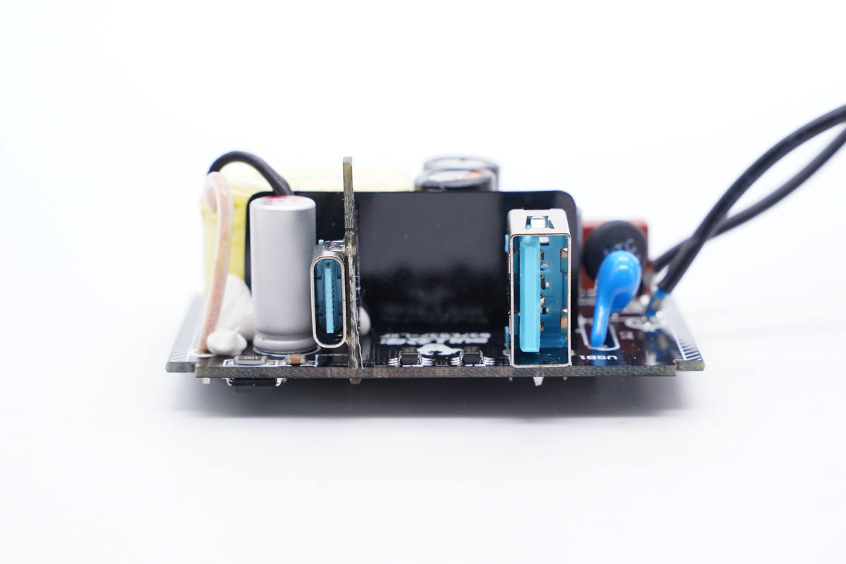輸出端一覽,兩側設有固態電容和Y電容,USB-C母座焊接在小板上。