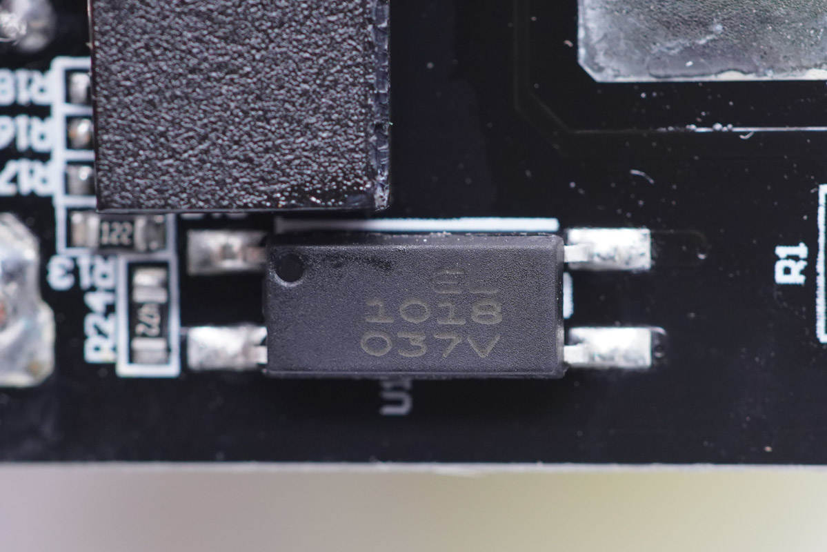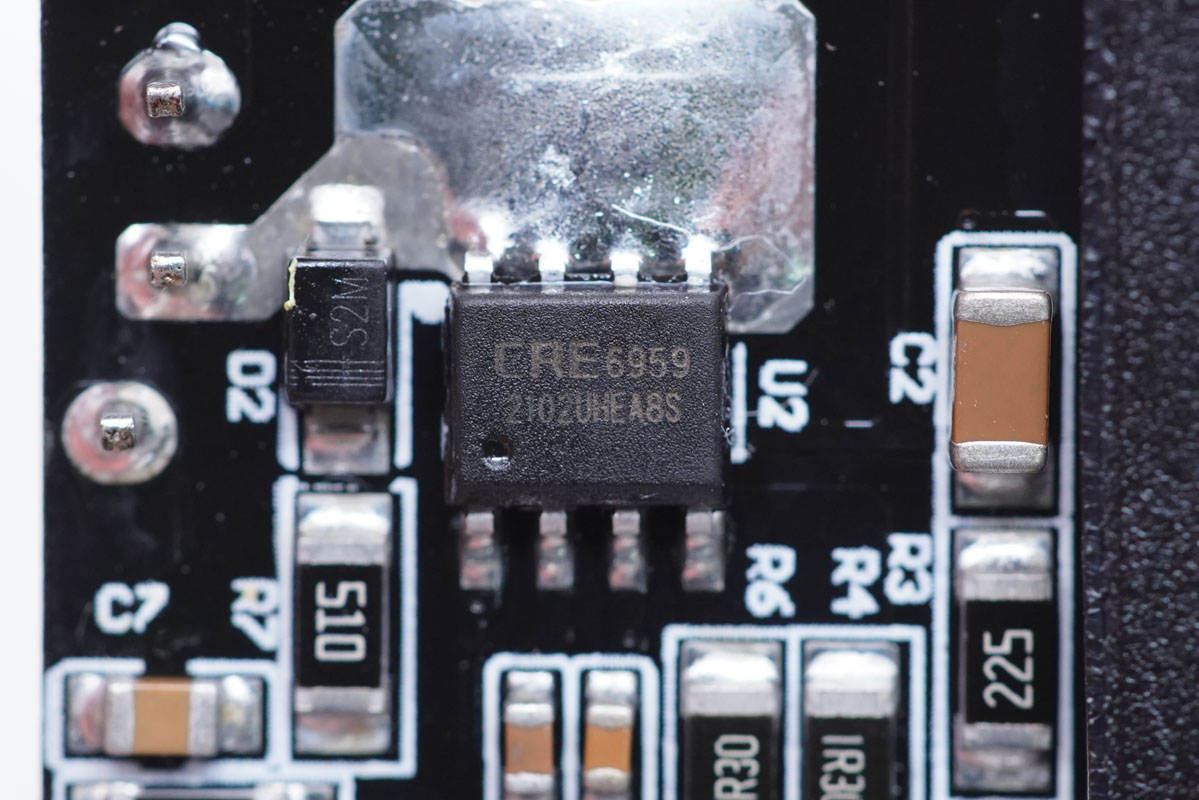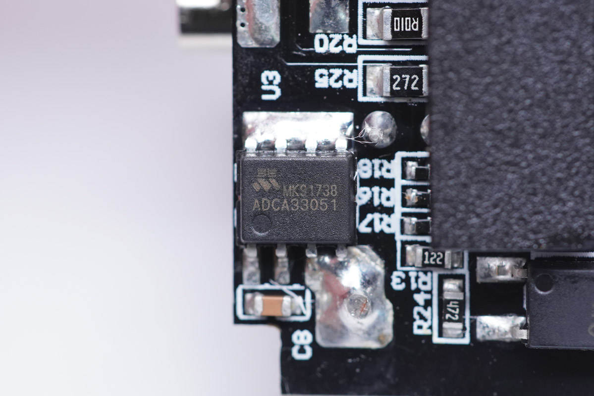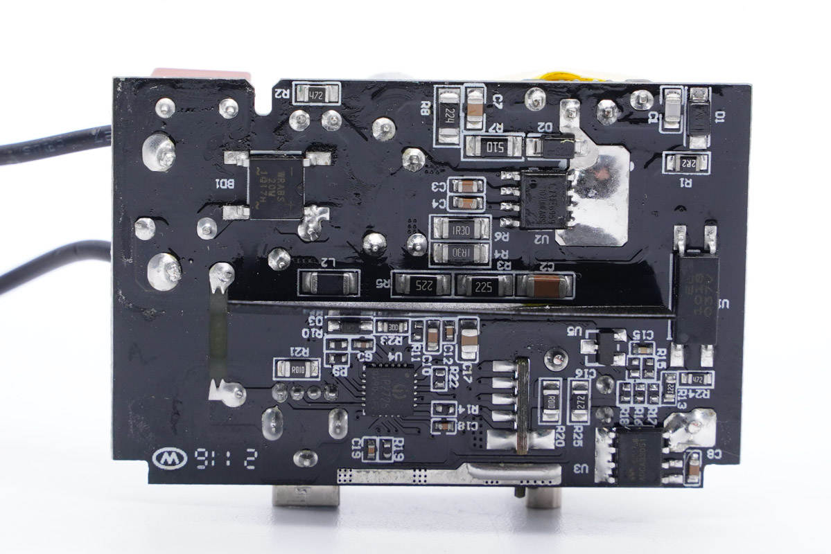 PCB板背面一覽,上方是整流橋和開關電源主控芯片,下方是同步整流芯片和協議芯片。