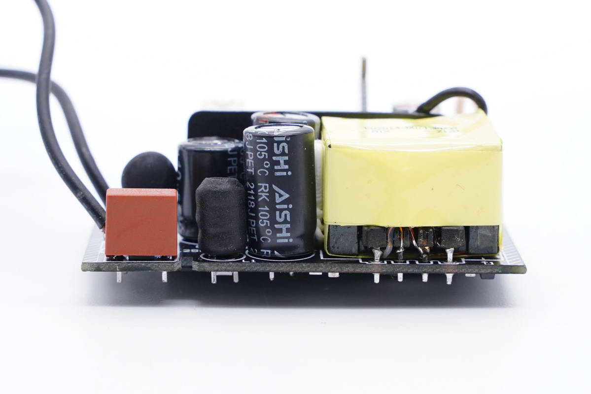 板子前后排分別焊接初次級元器件,之間有塑料板隔離,層次分明。