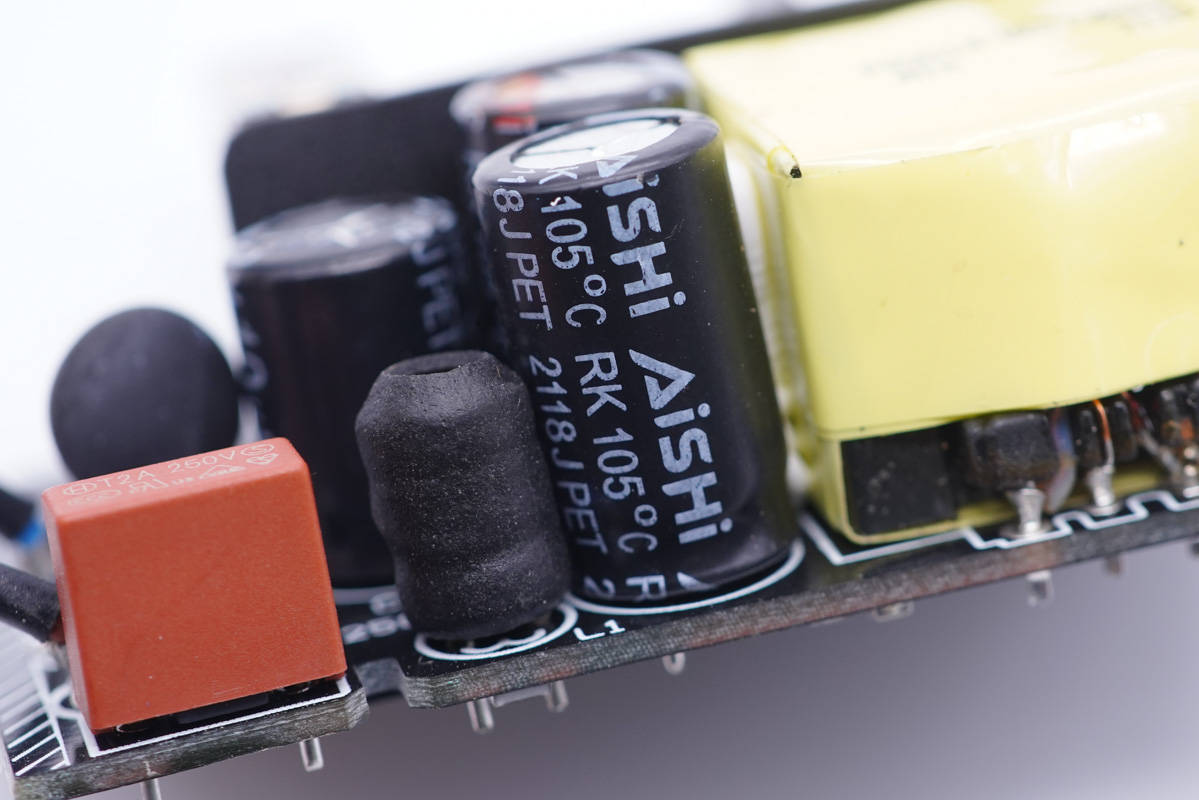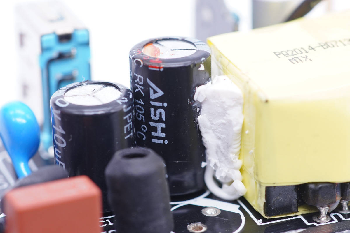 充電器初級側設有延時保險絲、工字電感、高壓濾波電解電容和變壓器等。