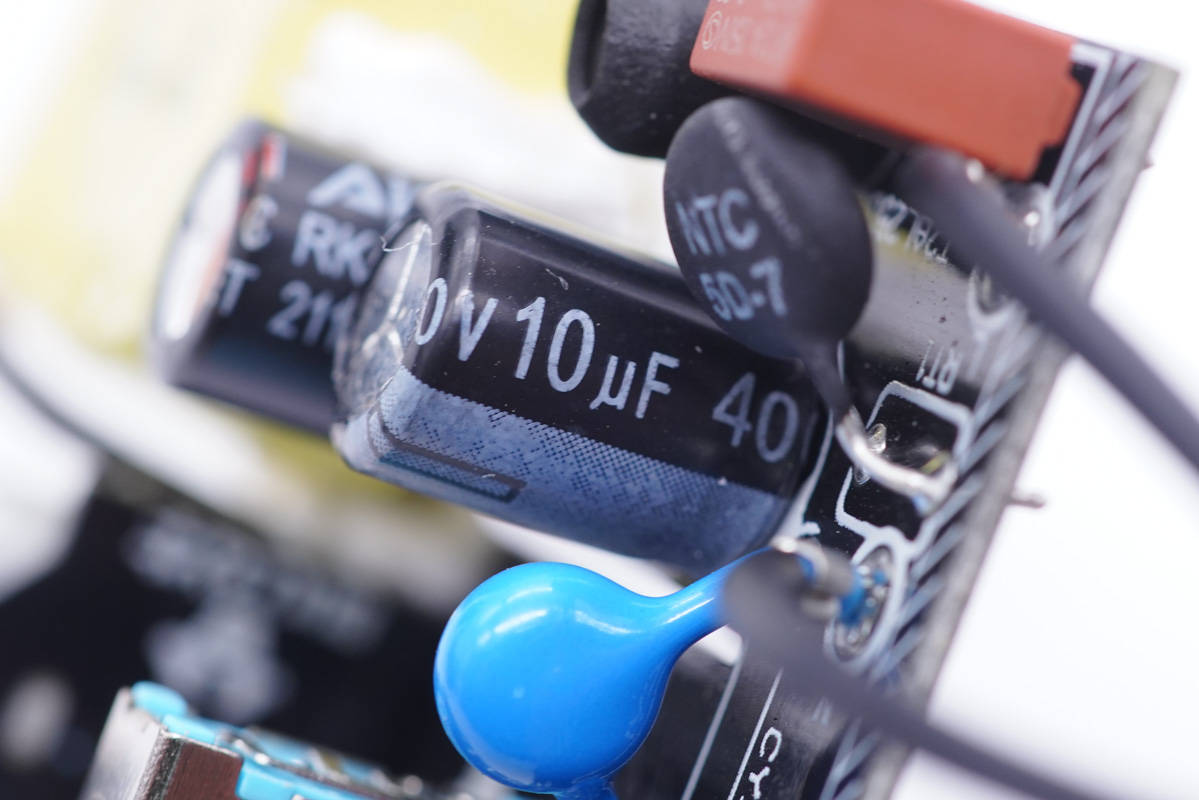 工字電感外套熱縮管保護,高壓濾波電解電容來自知名品牌艾華。