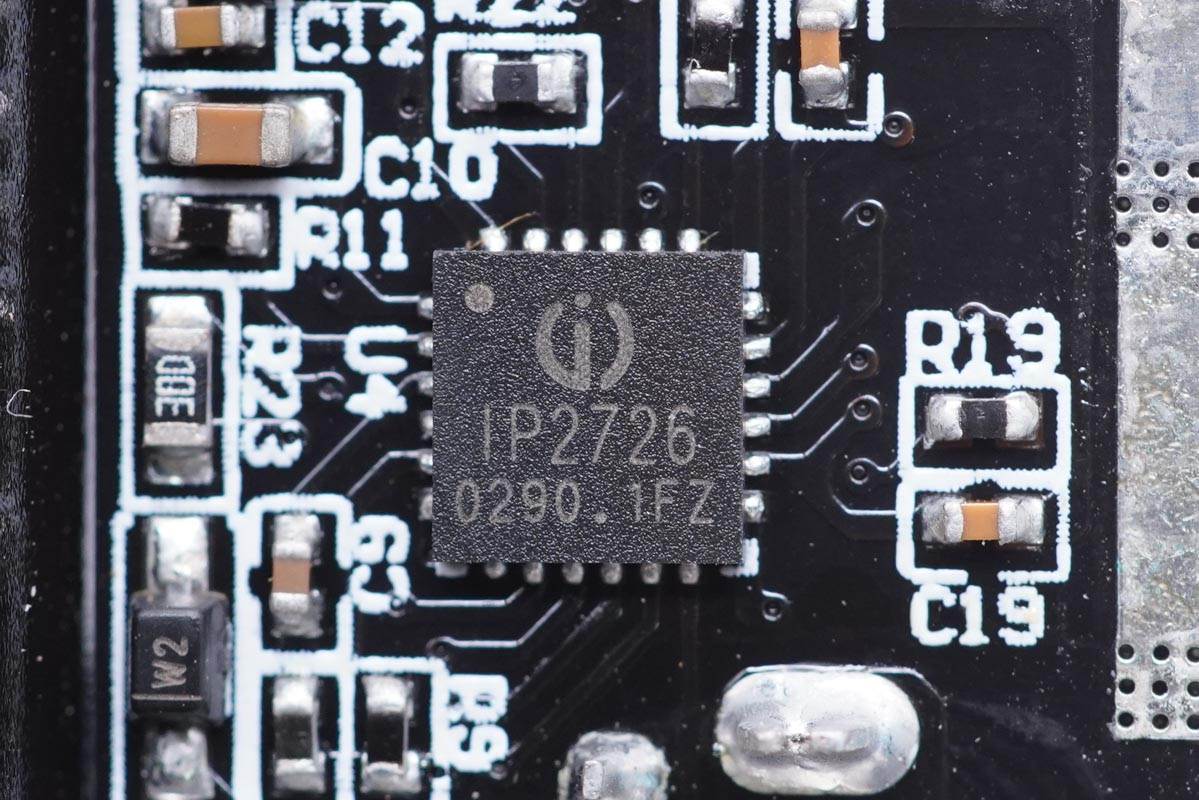 協議芯片采用英集芯IP2726,用于1A1C接口輸出電壓控制。IP2726是一顆集成多種協議、用于USB輸出端口的快充IC,支持Type-C DFP、PD2.0/3.0、PPS、QC4+、QC2.0/3.0、FCP、AFC、SCP、MTK PE+、Apple2.4A、BC1.2以及三星2A等協議。具有高集成度和豐富的功能,在應用時僅需極少的外圍器件,有效減小整體方案的尺寸,降低BOM成本。