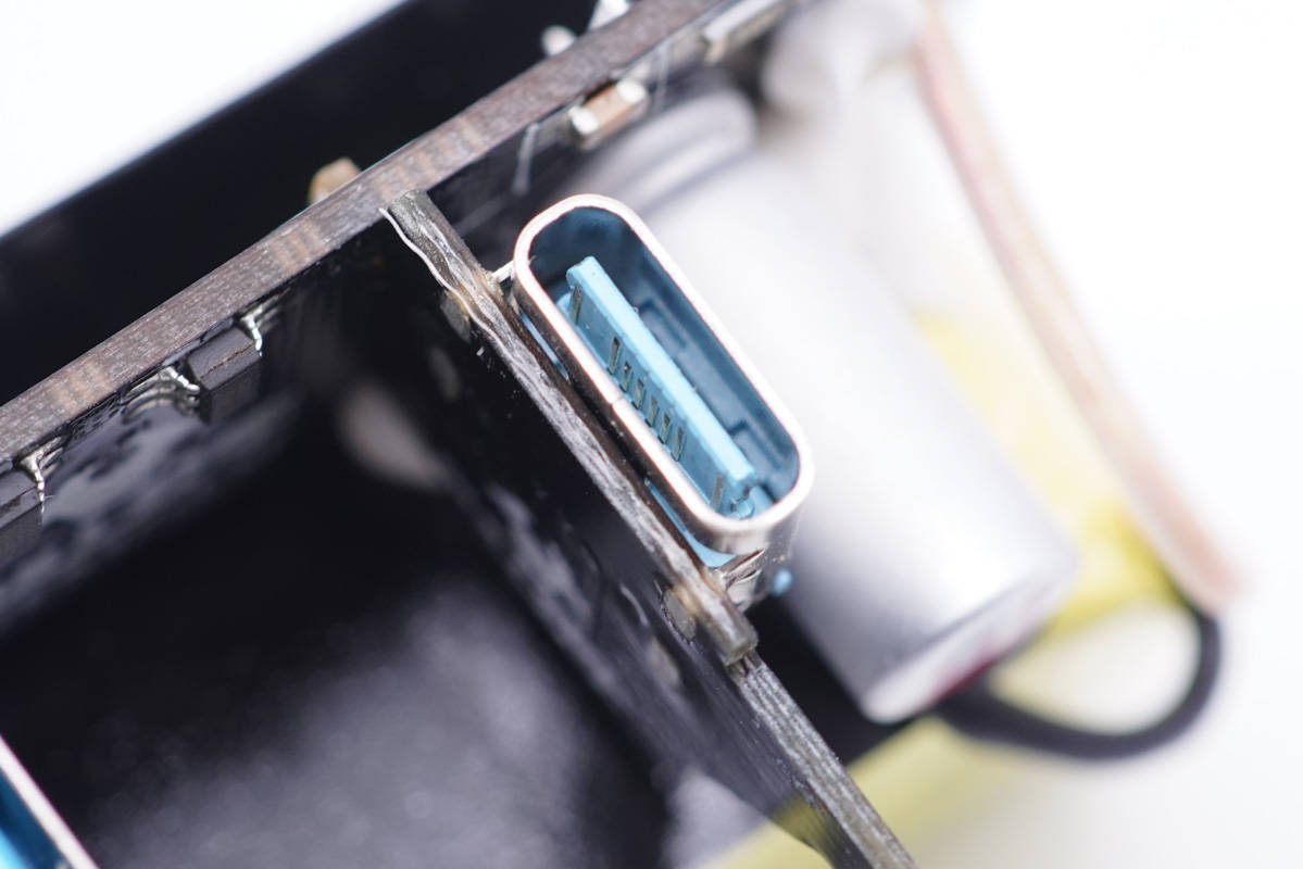 USB-C母座特寫,過孔焊接。母座舌片內部夾鋼片,藍色膠芯不露銅,工藝很好。