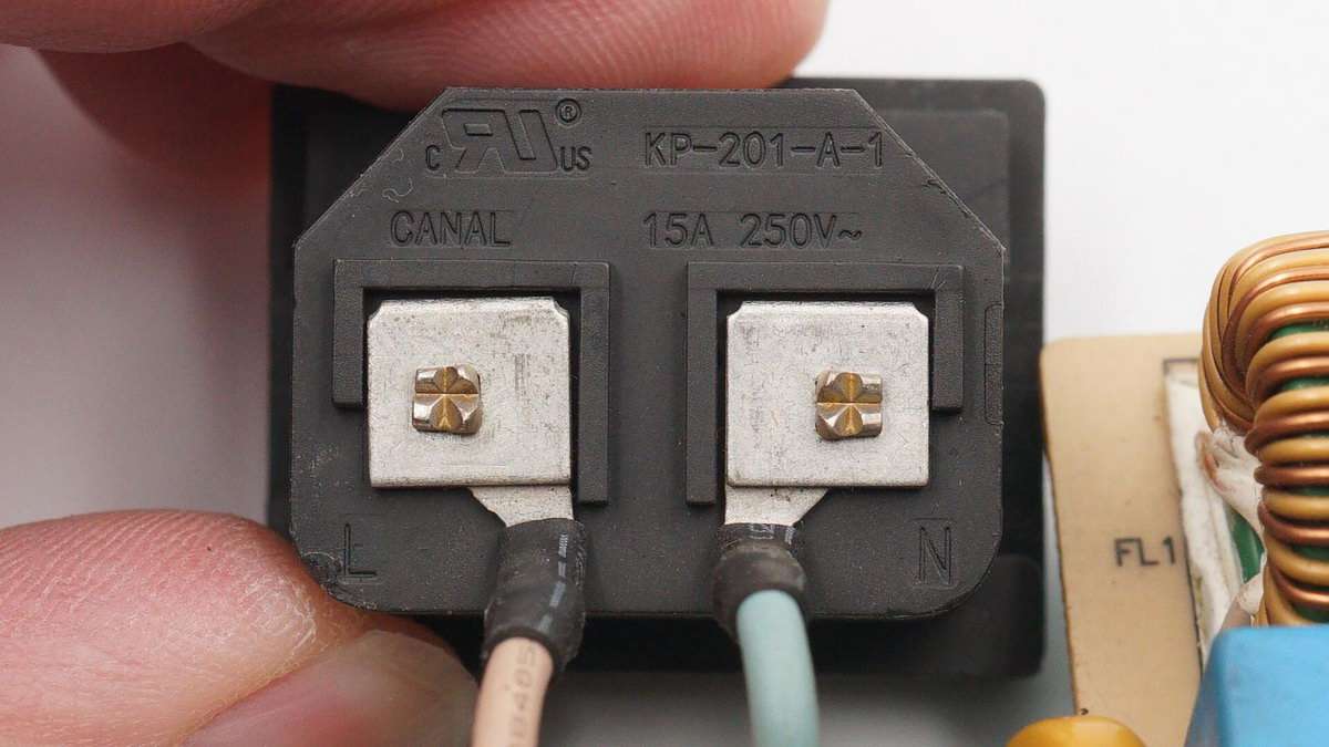 輸入端母座規格為15A 250V~,插腳和金屬片壓接,導線套有絕緣管。