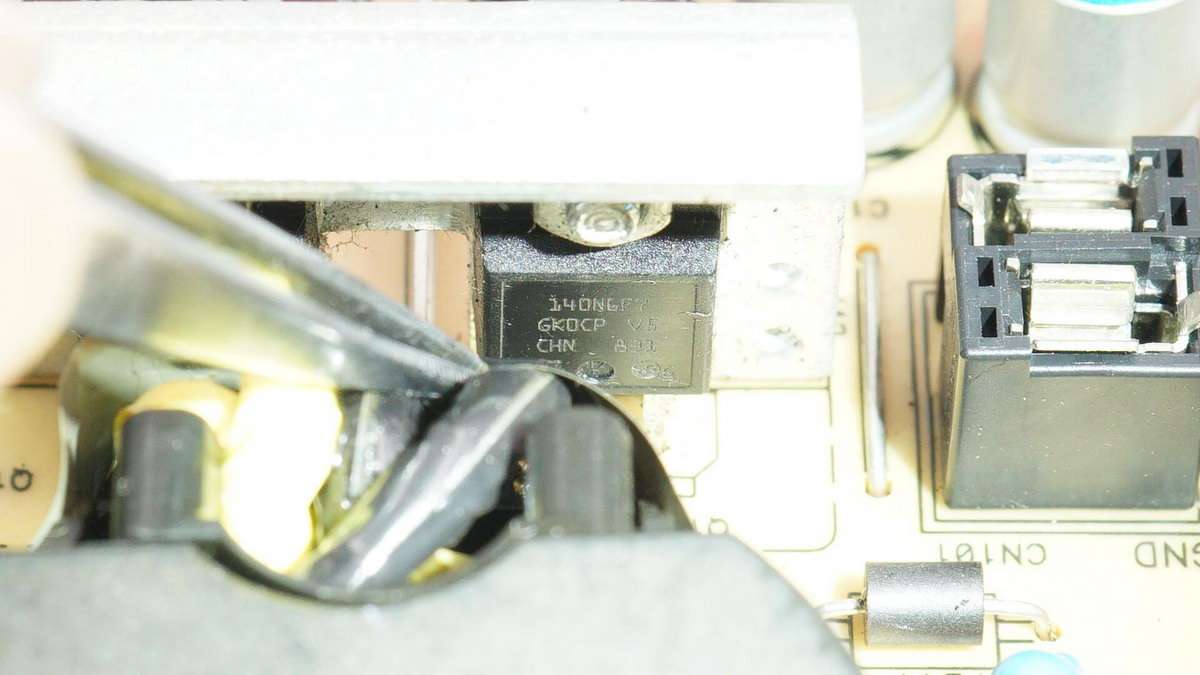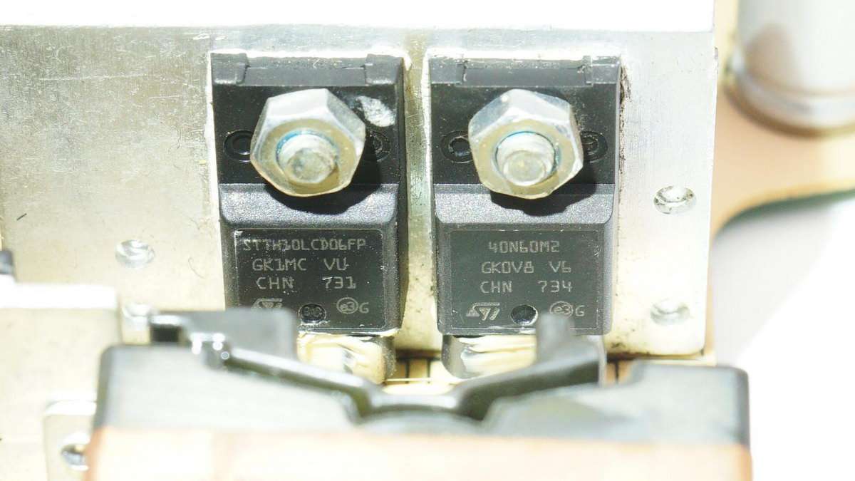 PFC升壓整流管(左)和PFC升壓開關管(右),均來自意法半導體,且均為TO220FP封裝。升壓整流管型號STTH10LCD06,超快恢復二極管,10A600V。升壓開關管型號STF40N60M2,NMOS,耐壓600V,導阻78mΩ。