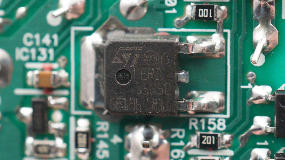 ST Fred15S50場效應二極管,耐壓50V,額定電流15A,內置ST的專有技術,標稱正向壓降為0.31V。